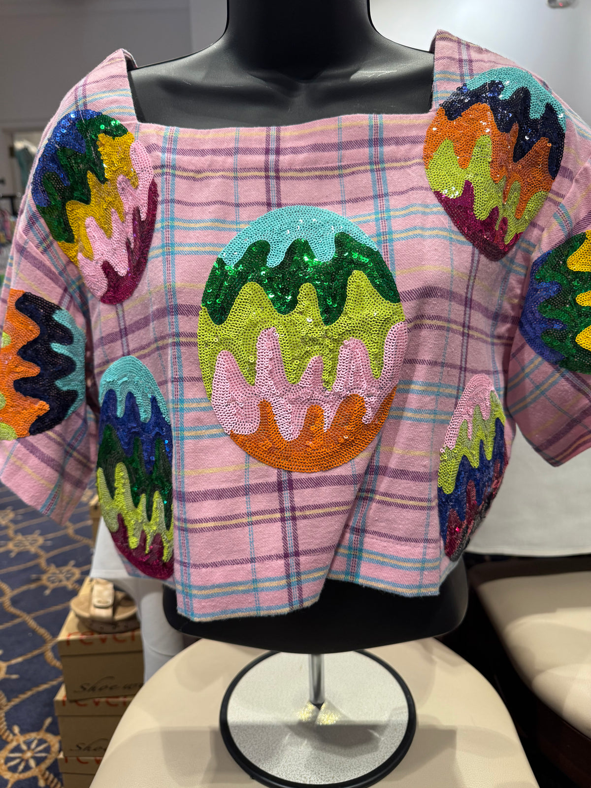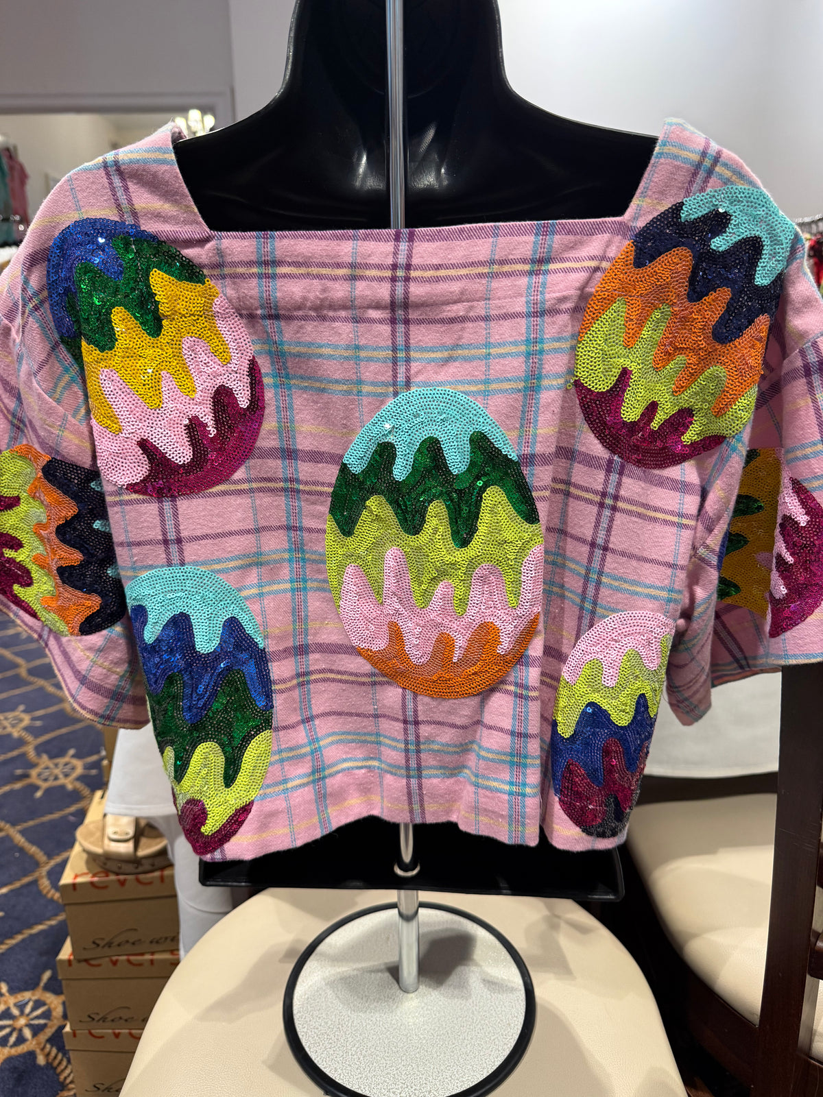 Embrace your playful side with our Queen of Sparkles crop top! Featuring a plaid pattern and sparkly eggs, this top is a statement piece that adds a touch of fun to any outfit. Made from heavy cotton, it's also comfortable and durable. Groovy, huh?