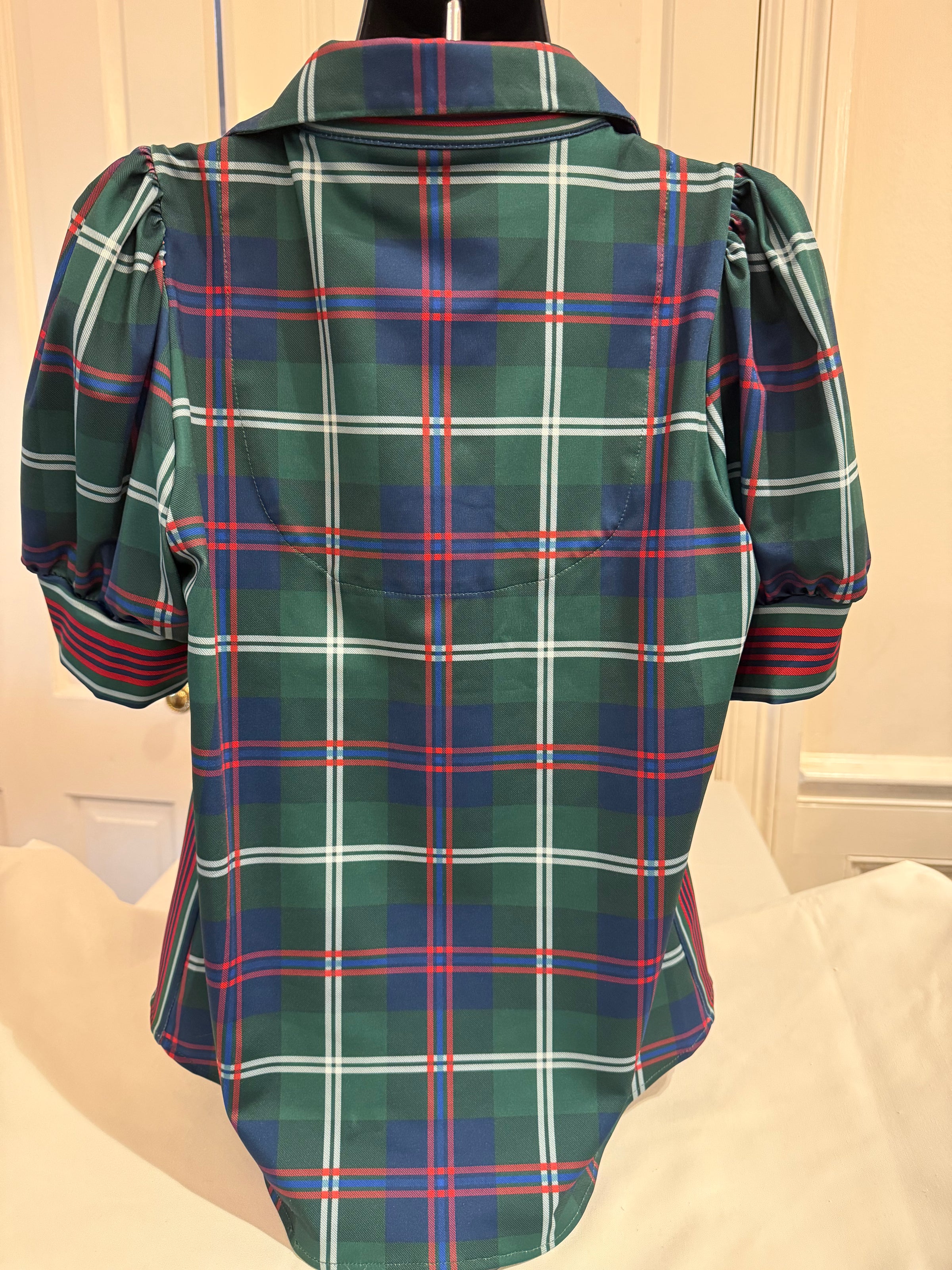 Elevate your wardrobe with timeless charm! This classic button-up features statement puff sleeves and a crisp stand-up collar that commands attention. Dressed in a sophisticated Middleton plaid in rich green, it pairs beautifully with everything from tailored trousers to your favorite denim. Gleaming gold buttons add a touch of luxury to every wear. Perfect for brunch dates, office days, or whenever you want to feel polished and put-together.