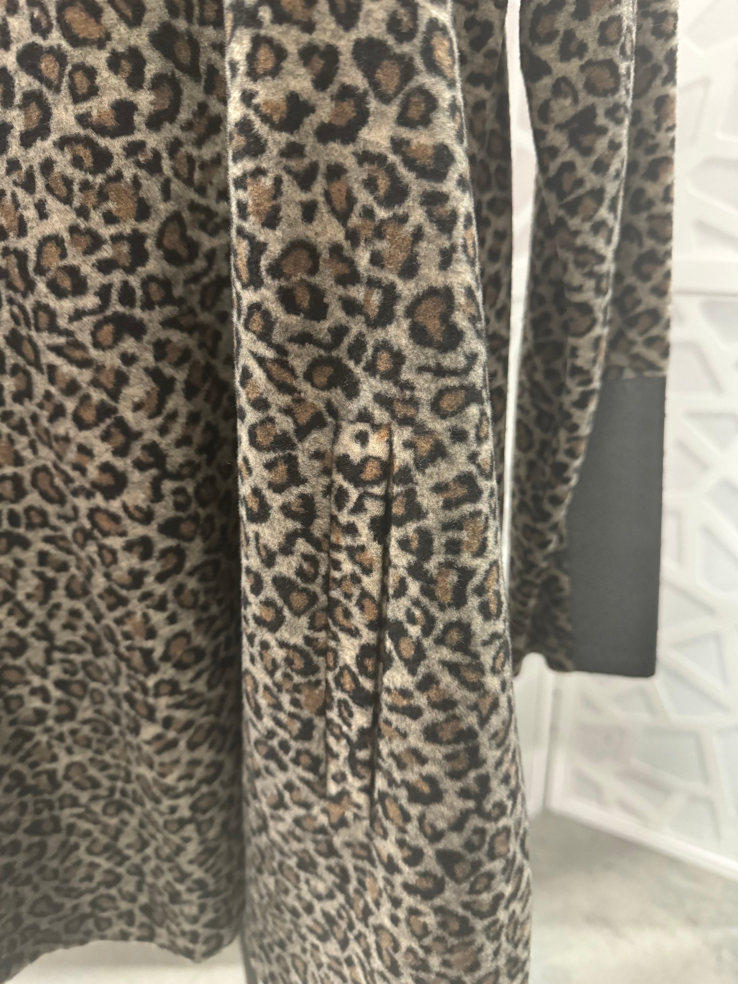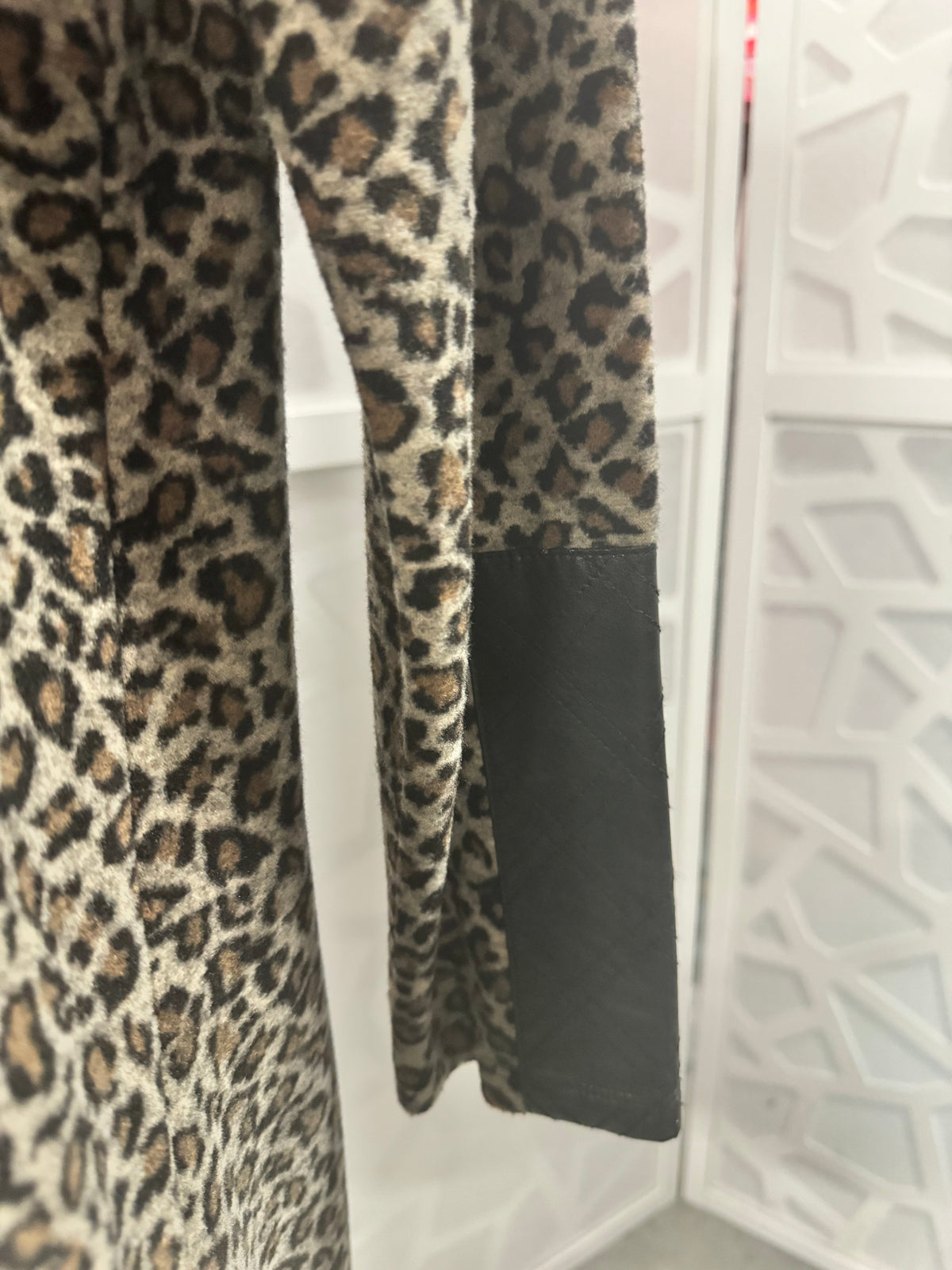 This Tyler Boe leopard print A-line dress is "purr"-fect for any occasion. With its soft, wool-like material, you'll stay comfy and warm all day long. The long sleeves, leather detail cuff, and mock neck add a touch of sophistication while the pockets offer convenience. Meow!