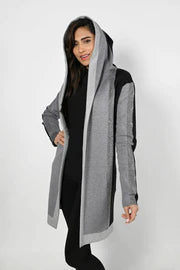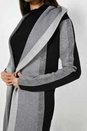 Look sharp in the Frank Lyman cardigan in black/grey striping. Crafted from a high-end fabric, this cardigan features beautiful sequin embellishment, slash pockets, and a stylish hoodie - a perfect addition to your wardrobe for any occasion. Elevated comfort, warmth and style.