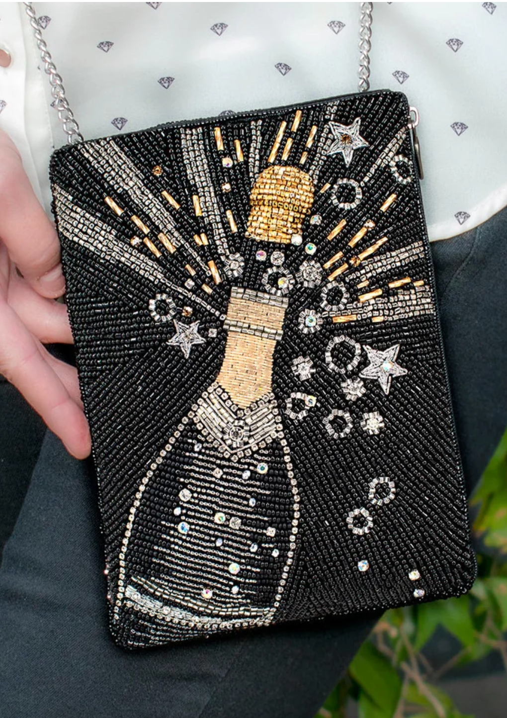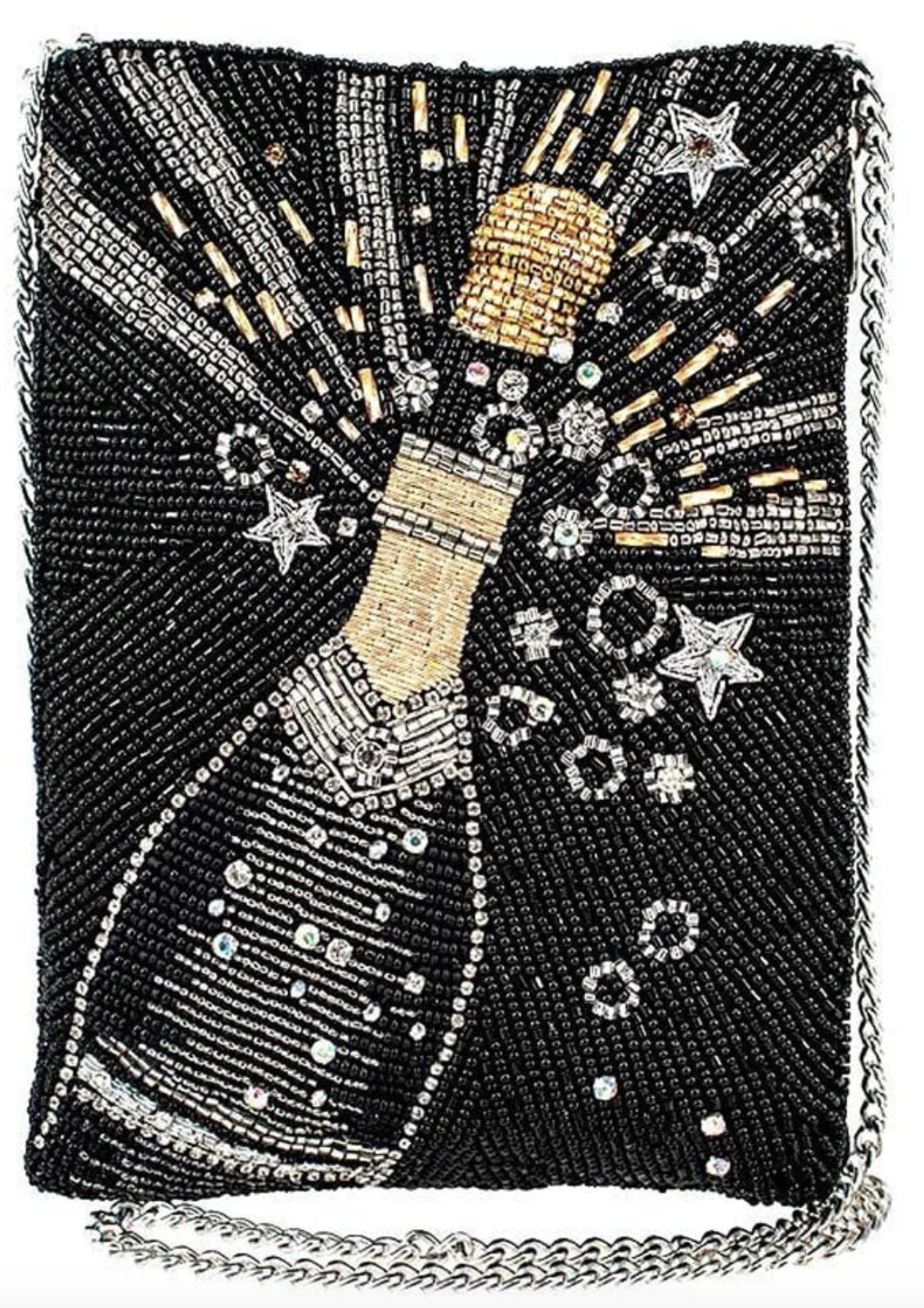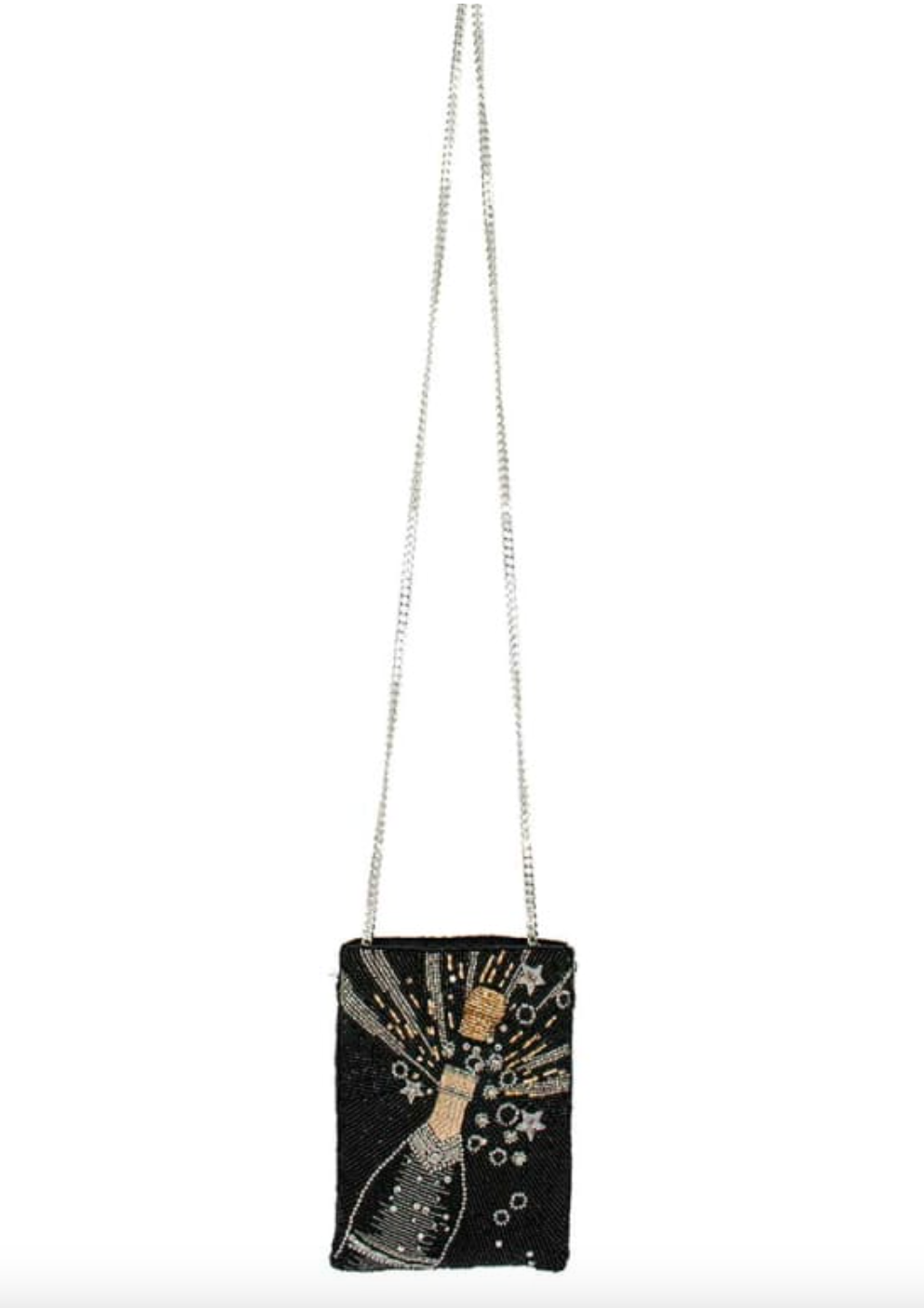 This mini handbag has it all! The classic hand-beaded champagne design is perfect for any size celebration or girls night out. Slide your phone in the top slip pocket and store eye-glasses and all your essentials in the side zip pocket.