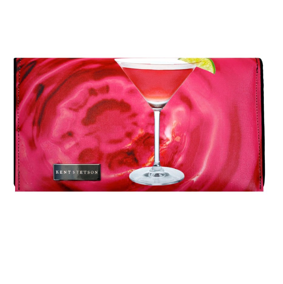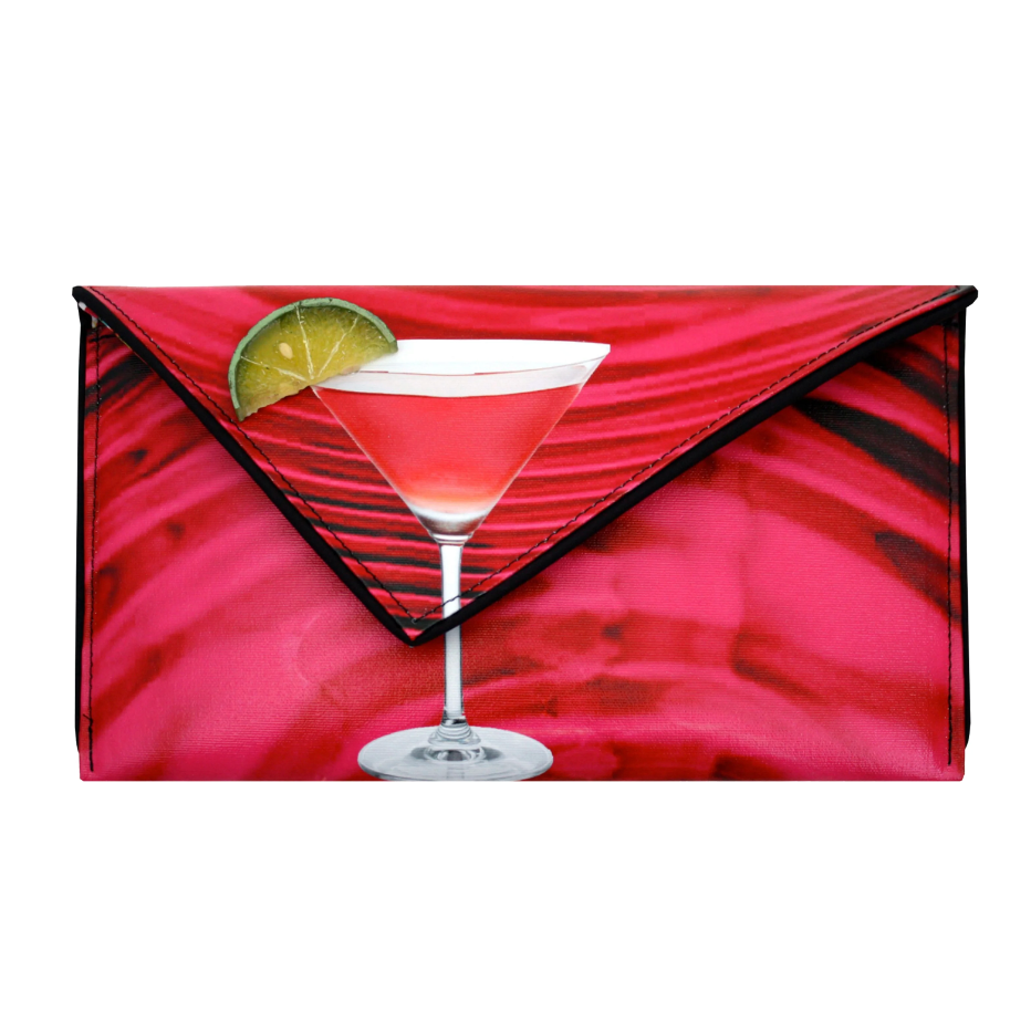 Gorgeous asymmetrical clutch featuring a delicious cosmopolitan. Features 3D lime attachment. Cruelty-free, made from luxury quality coated canvas. All bags come with a removable cross-body chain, logo dust bag, clear vinyl inner pocket, and are individually signed. Inside fabric may differ from what is pictured. Price includes shipping.