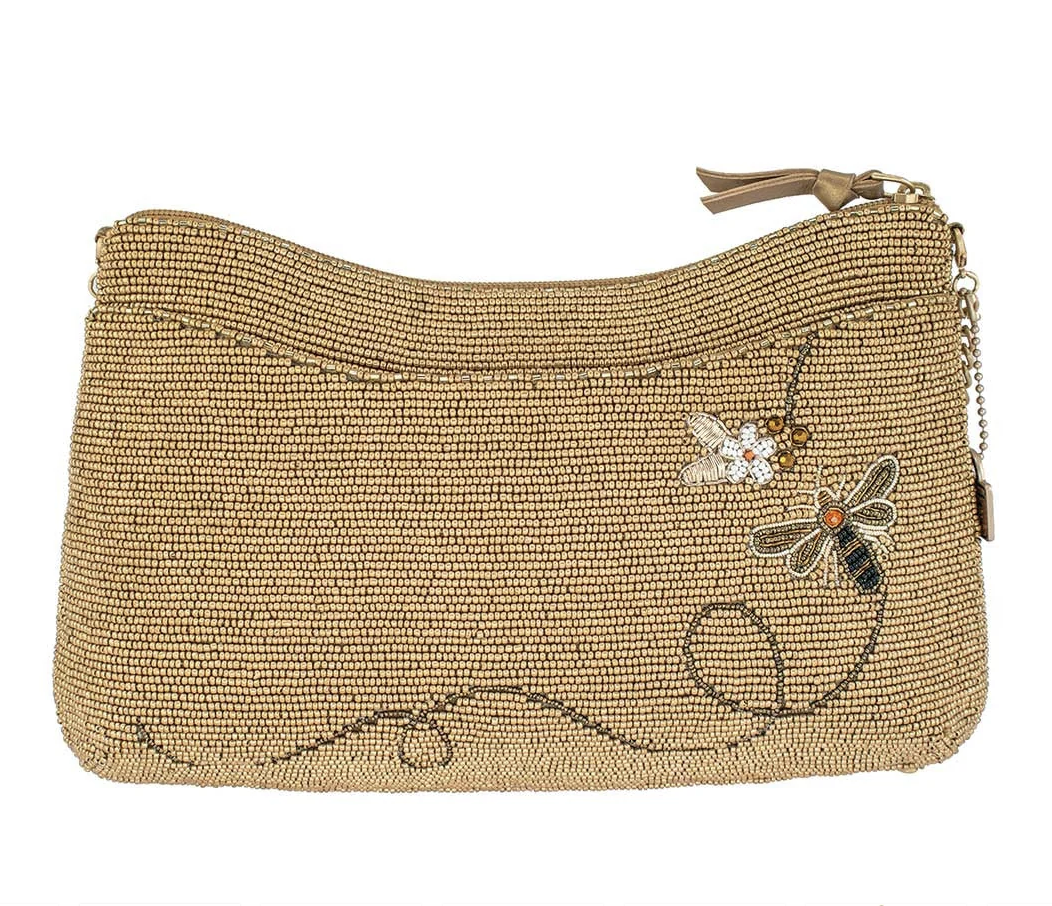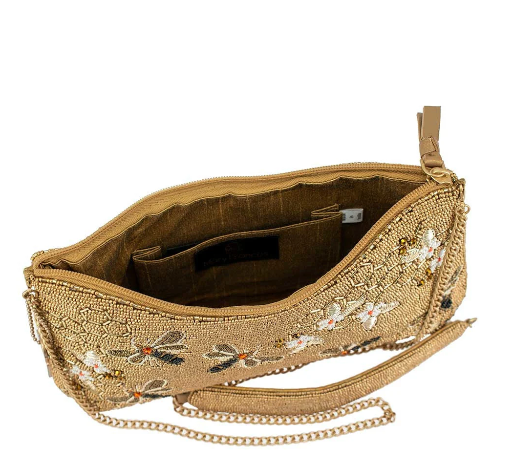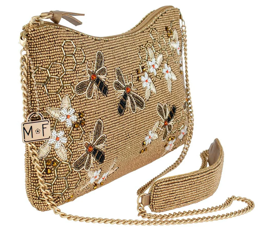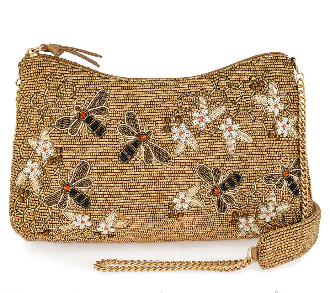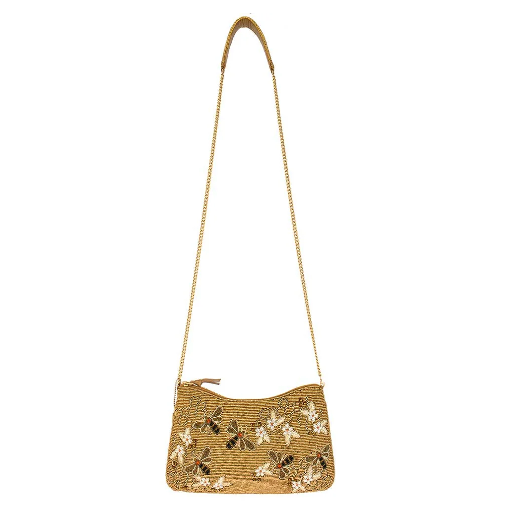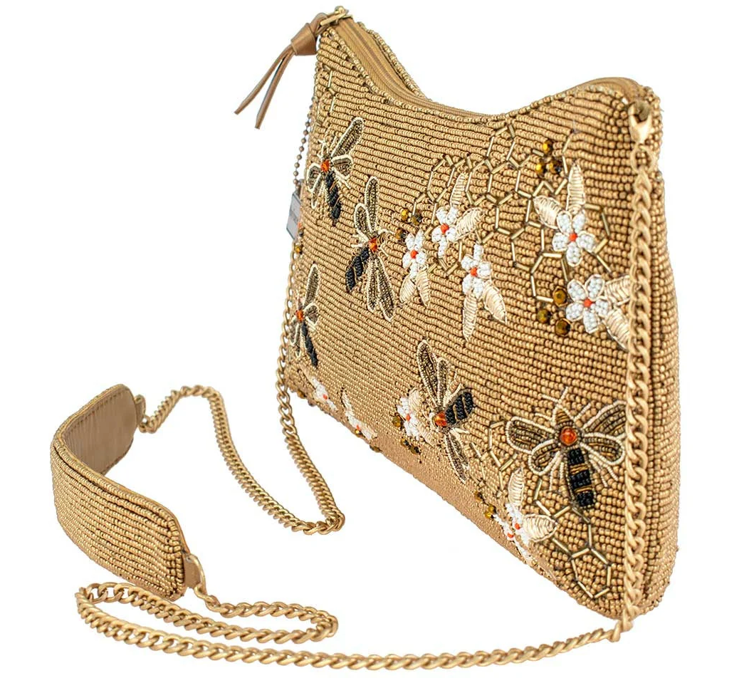 This crossbody handbag is a buzzing beauty, with golden beads woven into a honeycomb pattern and embellished with beaded bees and flowers. Its roomy interior, padded shoulder strap and secure zipper make it the perfect companion for any occasion.