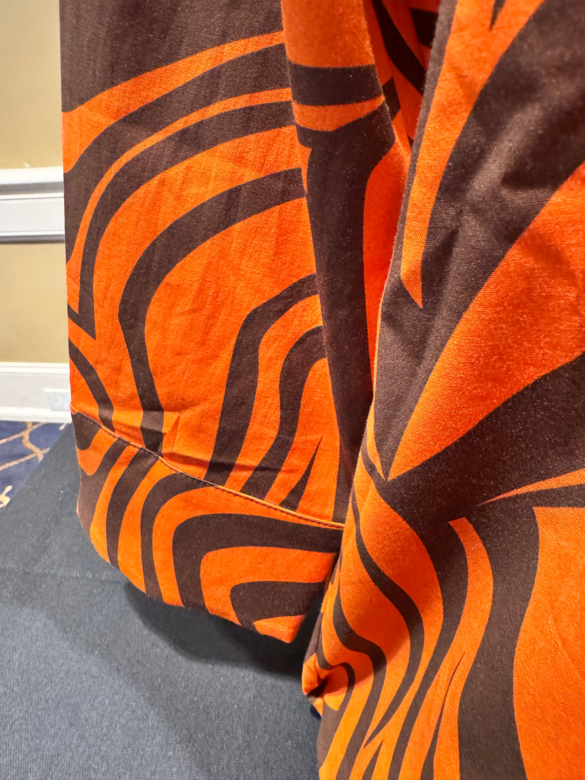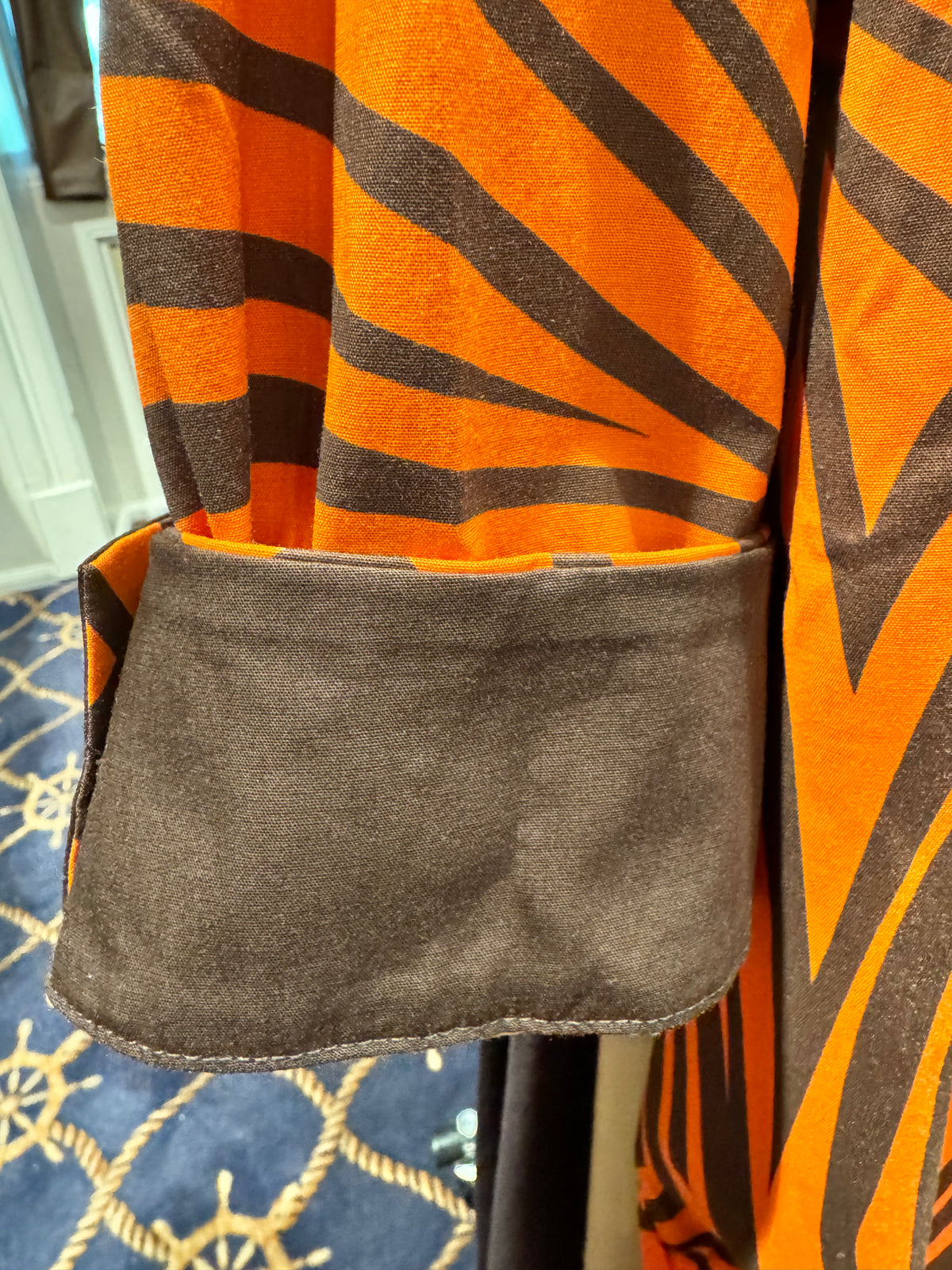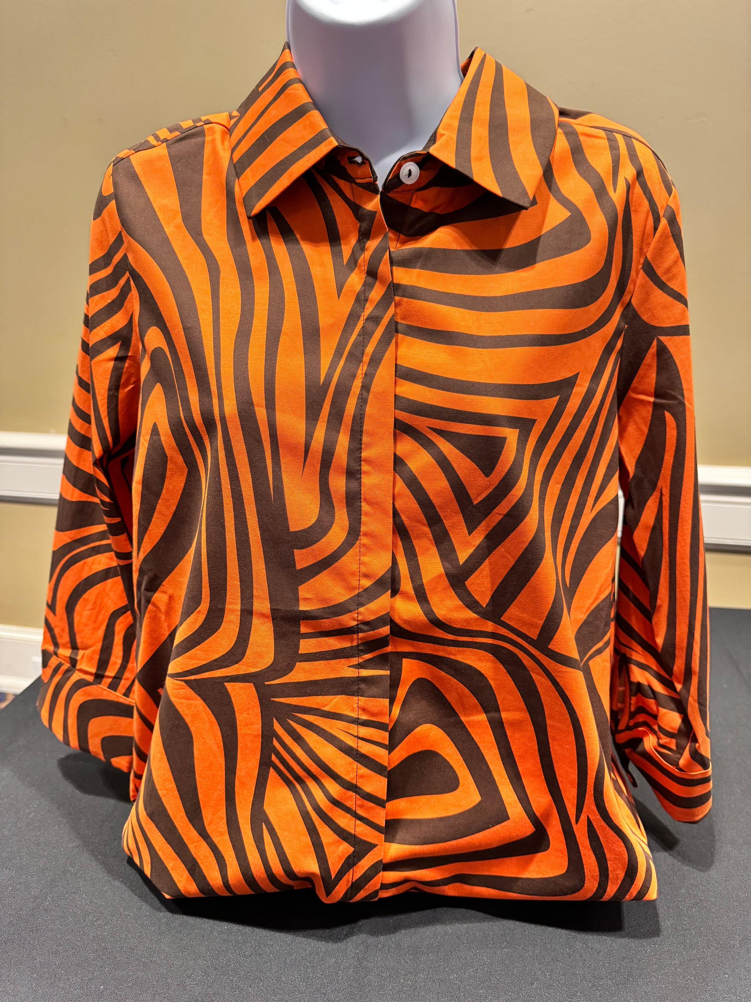Get your groove on with this stylish button-up, collared shirt by Perlavera, well made in Boca Raton, FL. Retro orange with brown tiger stripes.