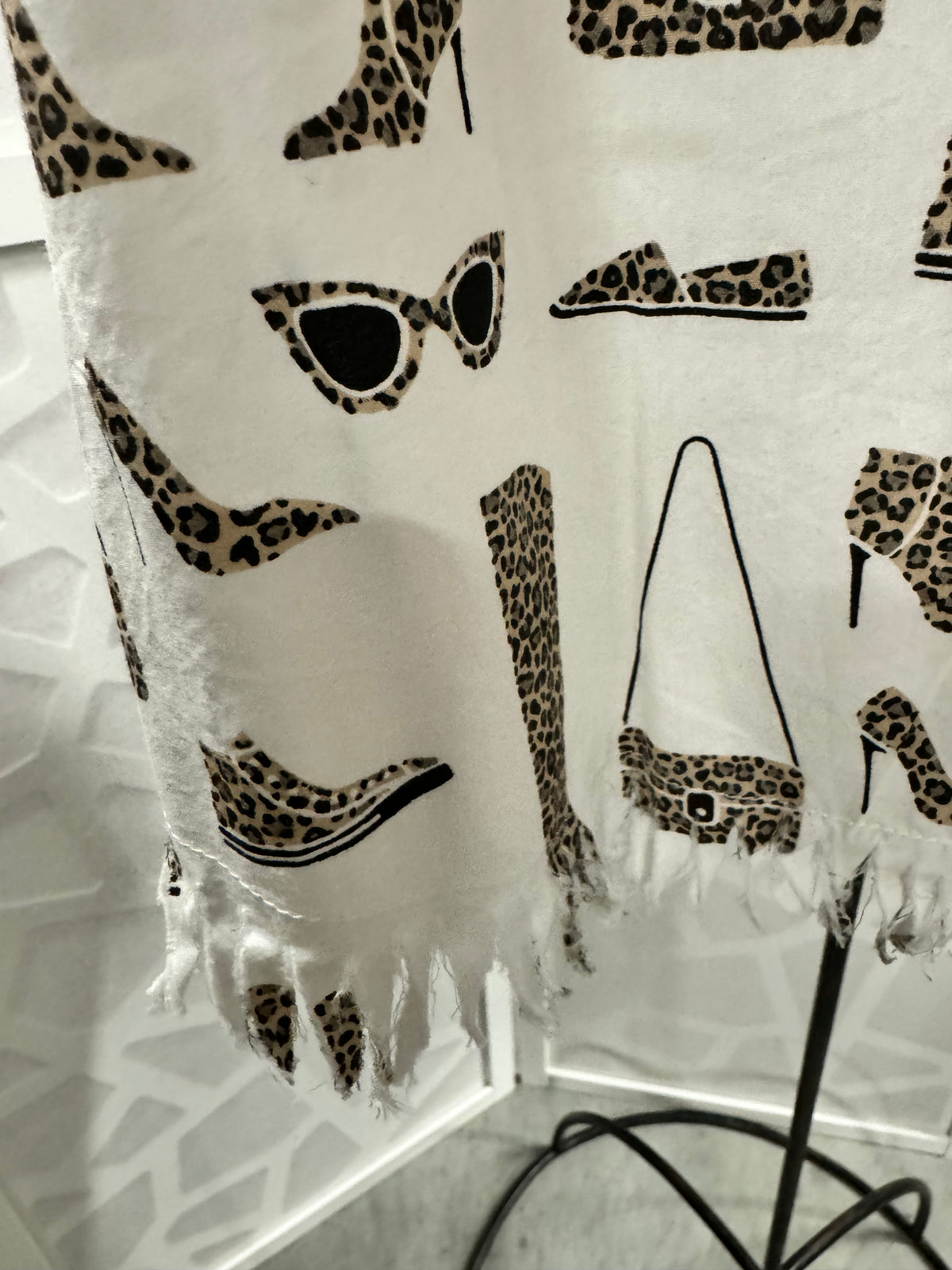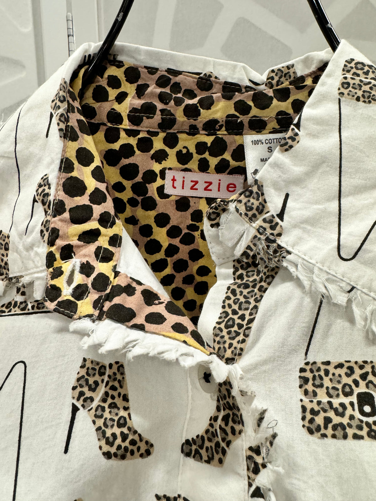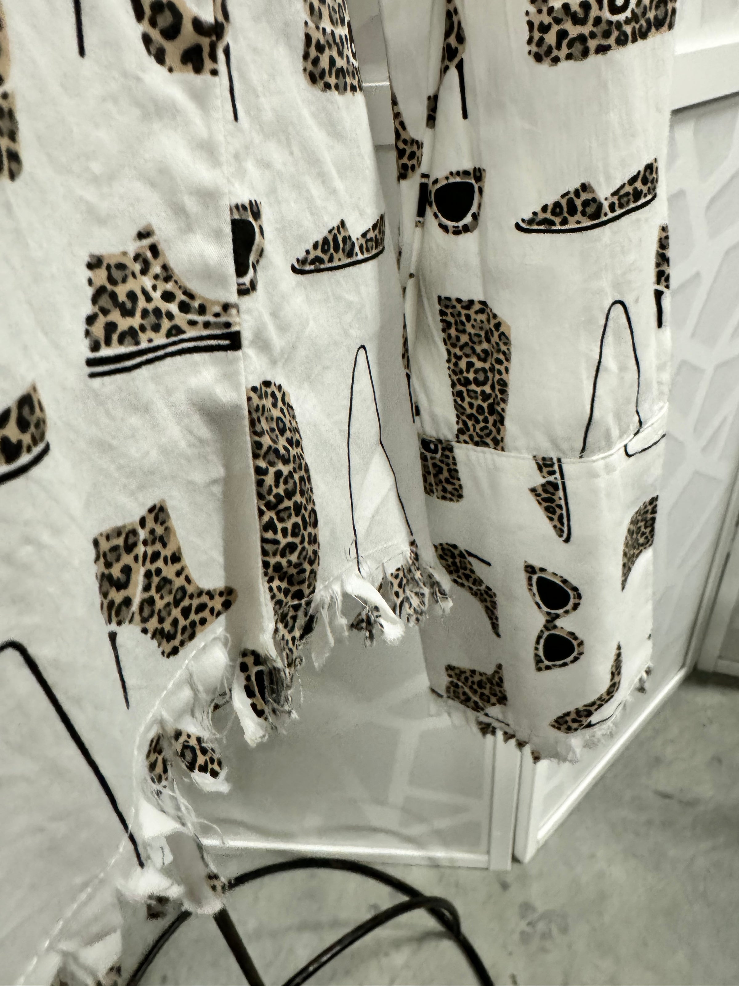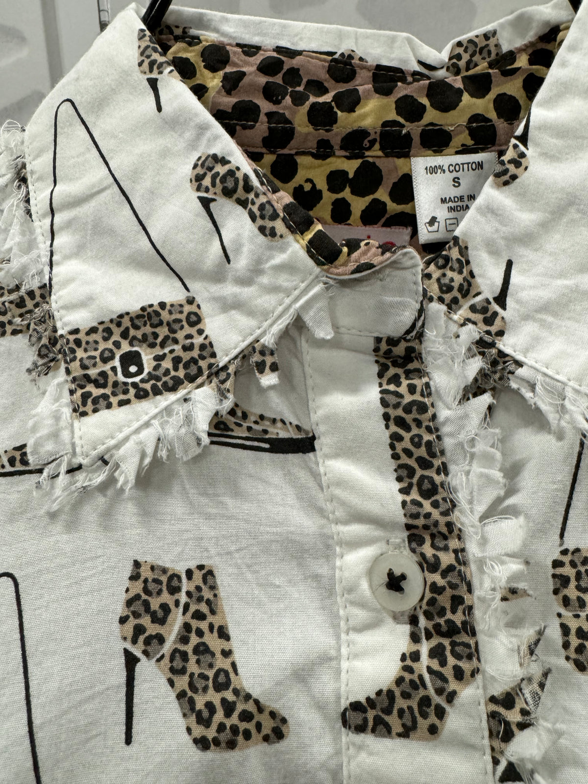 Bring out your wild side with this fashionista inspired button up shirt with collar and cod fringe. White with cheetah print heels, boots & shades and purple, brown and black cheetah print lining.