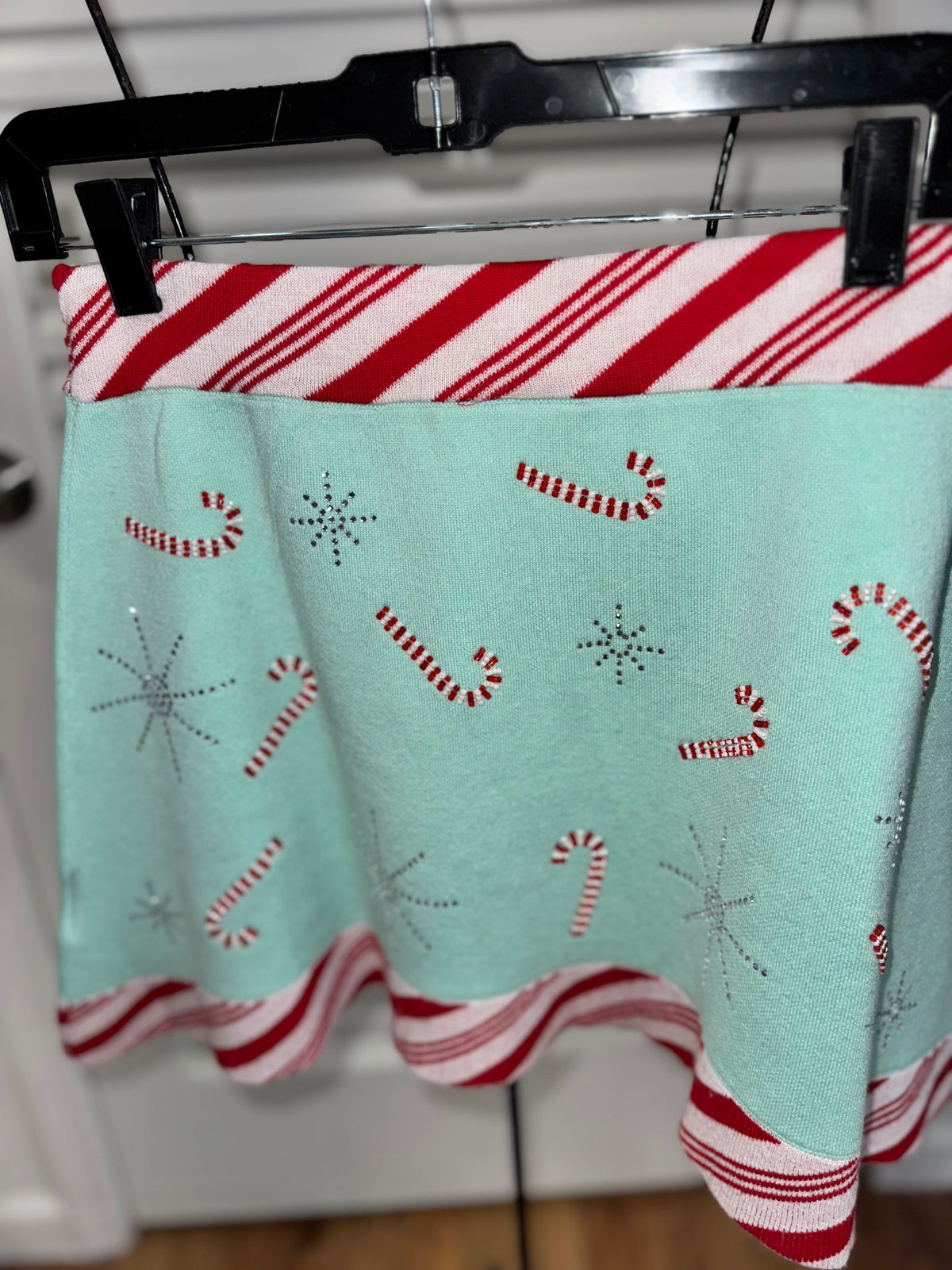 Get into the holiday spirit with our Queen of Sparkle - Candy Cane Skirt! This flirty and fun mini skirt is made of cozy sweater material and features blinged out candy canes and peppermint striped trim for some extra holiday cheer. It's the perfect addition to your festive wardrobe!