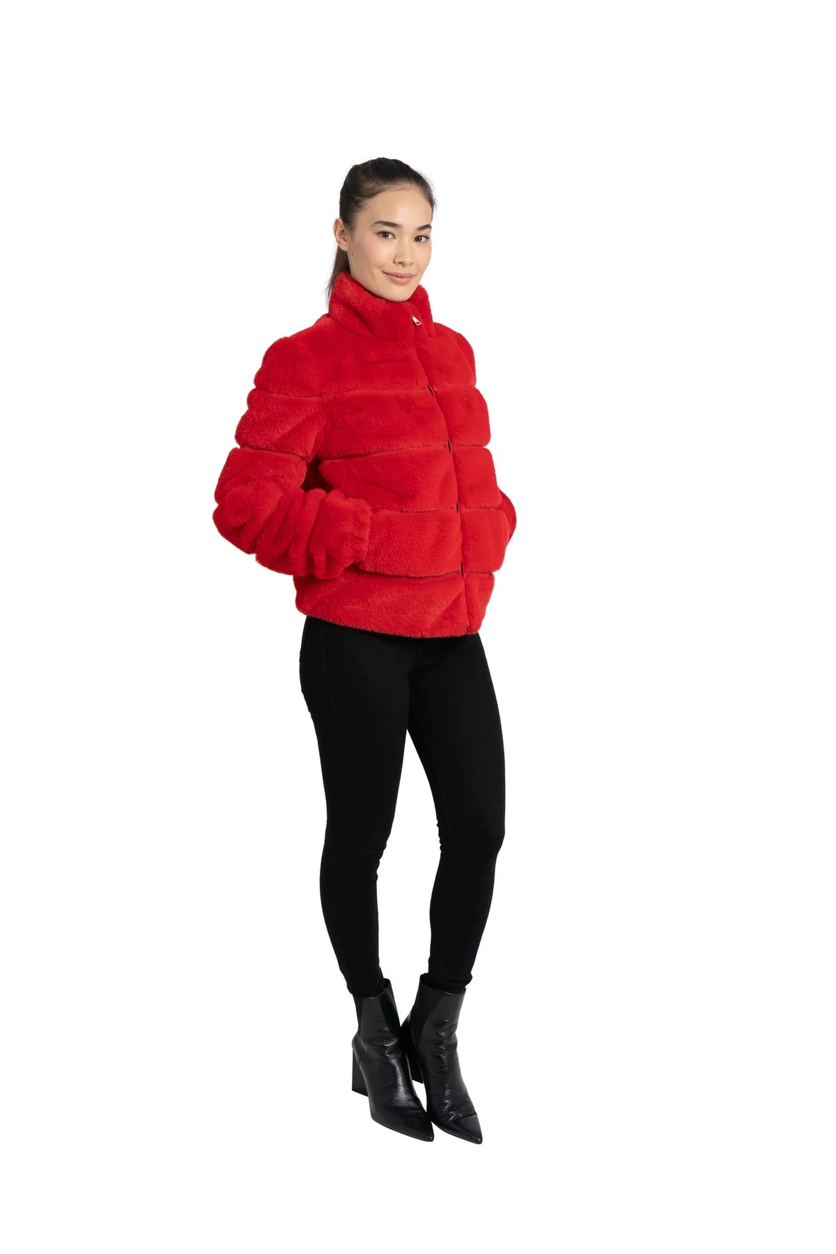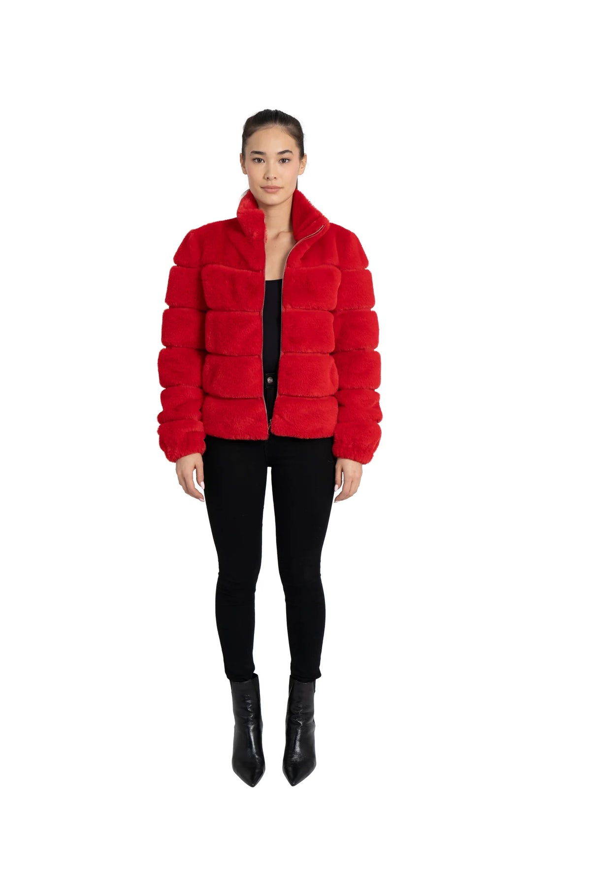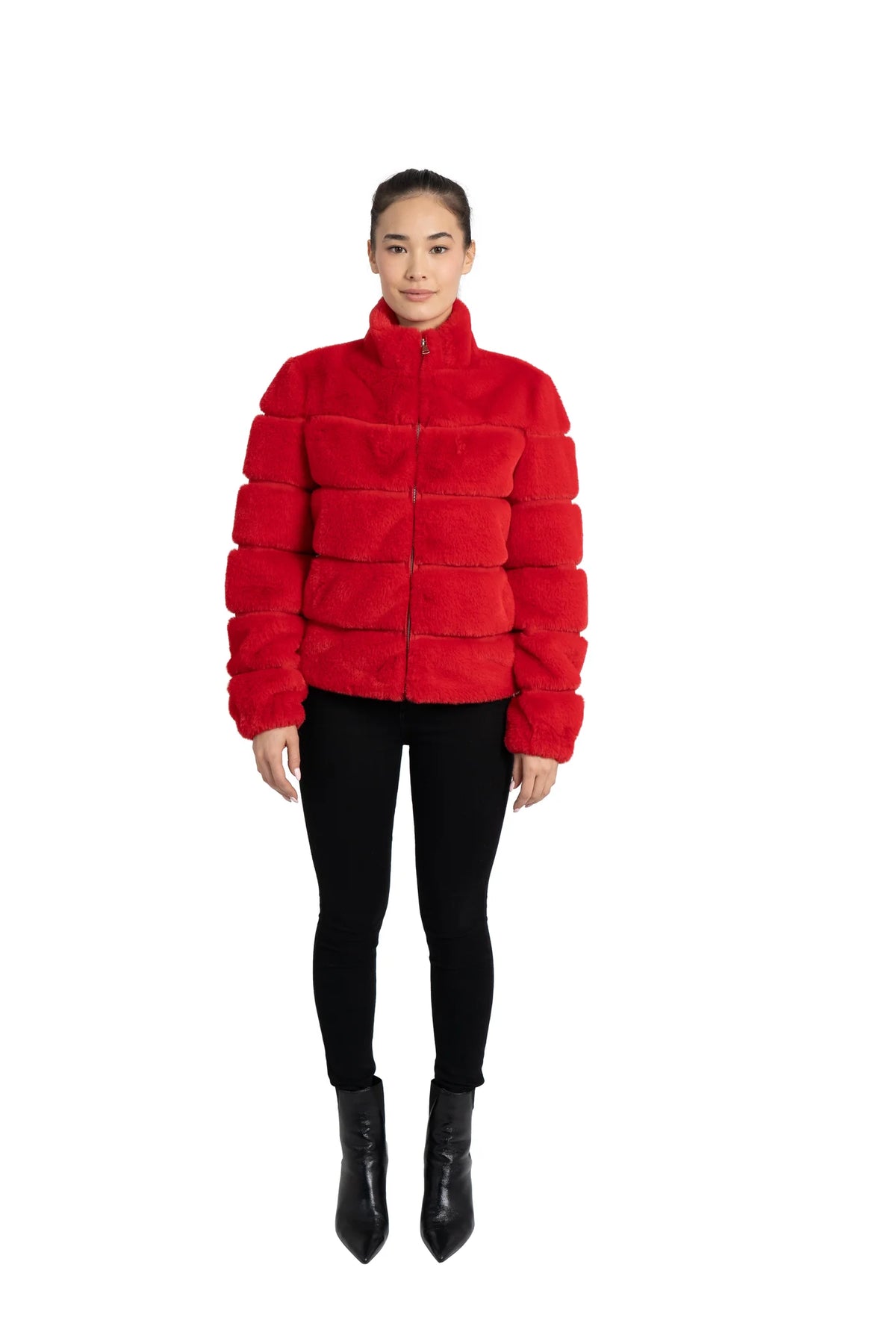 A Love Token best seller. Our show stopping faux fur jacket is a head turner in vibrant red (also available in hot pink). Be bold, warm and comfortable in this super duper soft coat with full zip front, a stand collar, and two working slit pockets.