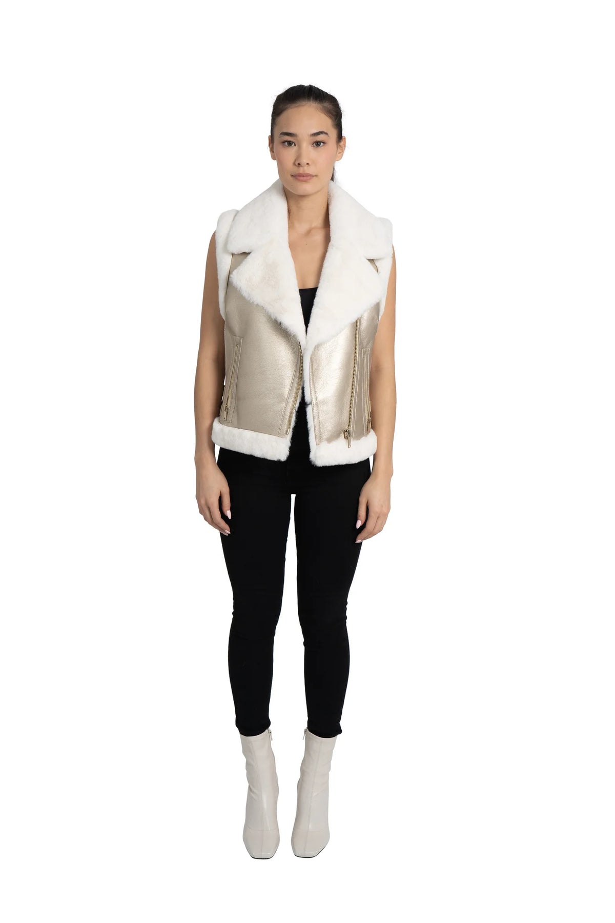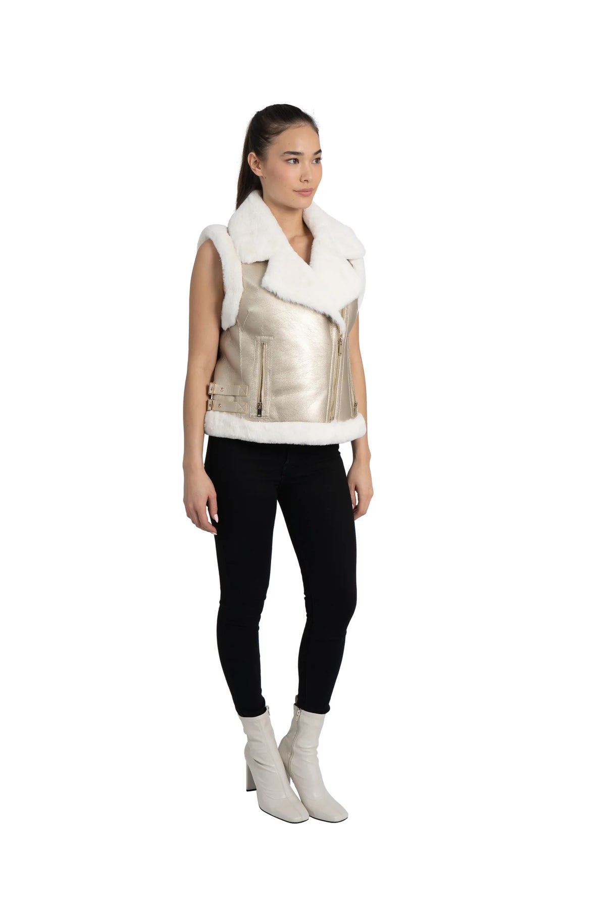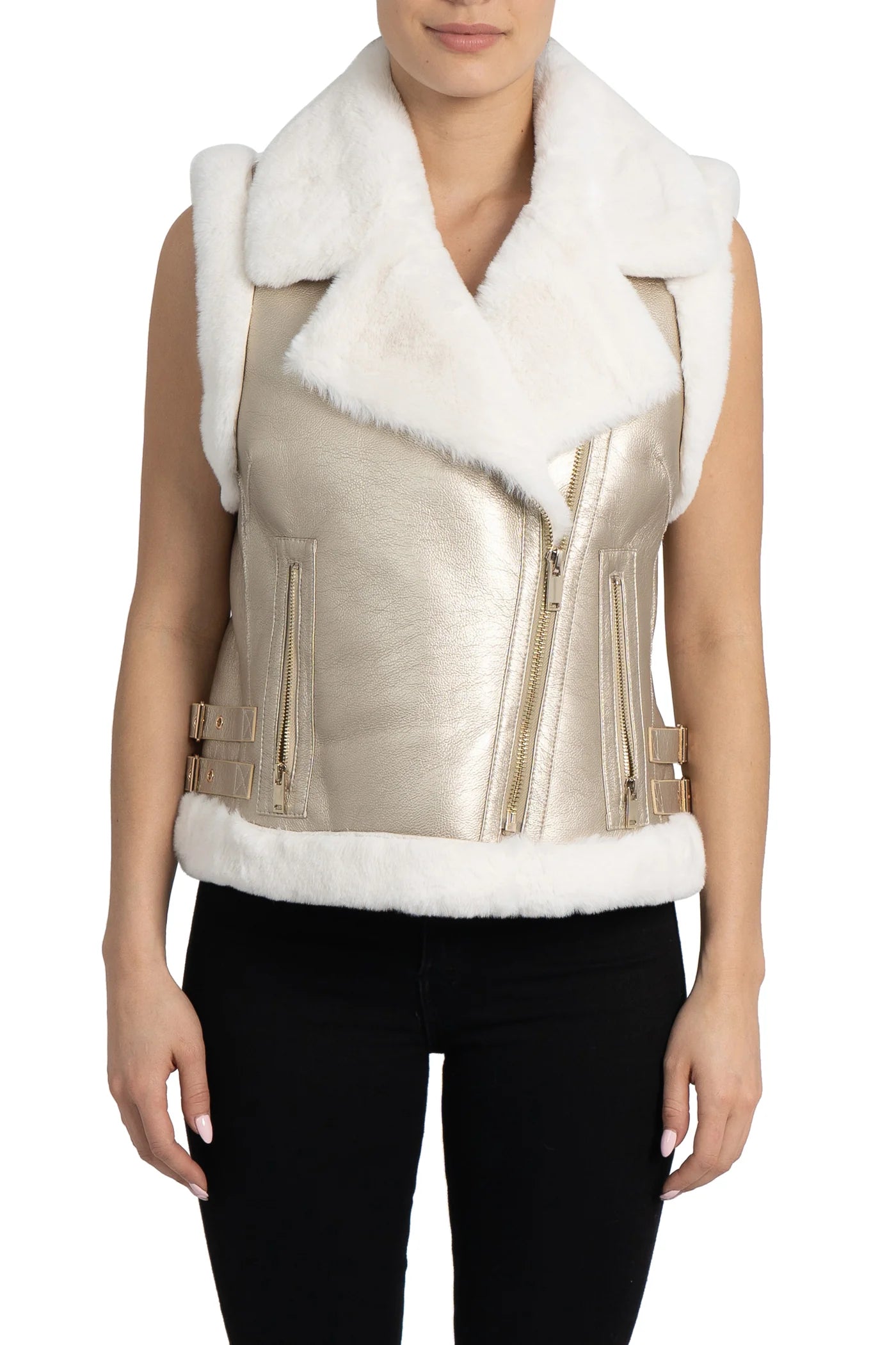 Unleash your edgy side with our Love Token Gold Moto Vest. Featuring a faux leather shell and faux fur lining, this vest will keep you warm and stylish. The faux fur notched lapel collar, front zip closure, and belt detail on the waist add unique touches. Add some shine to your wardrobe with this gold moto vest.