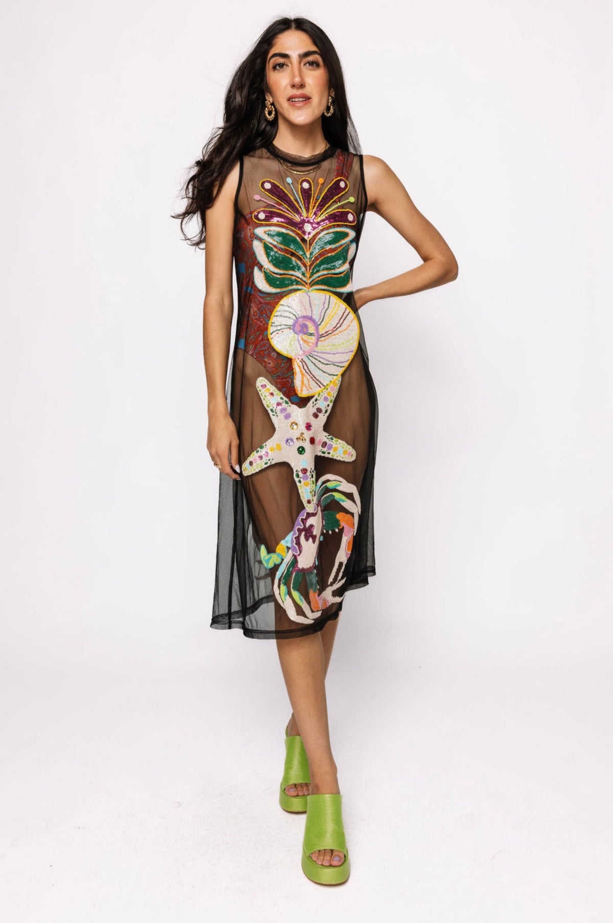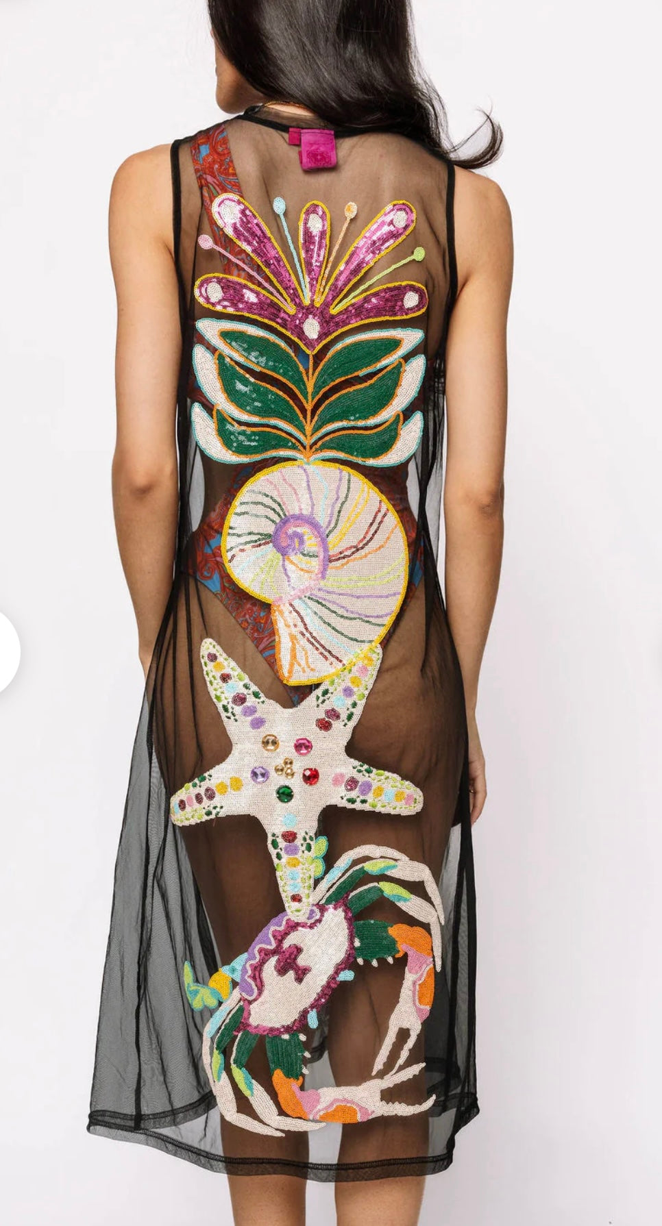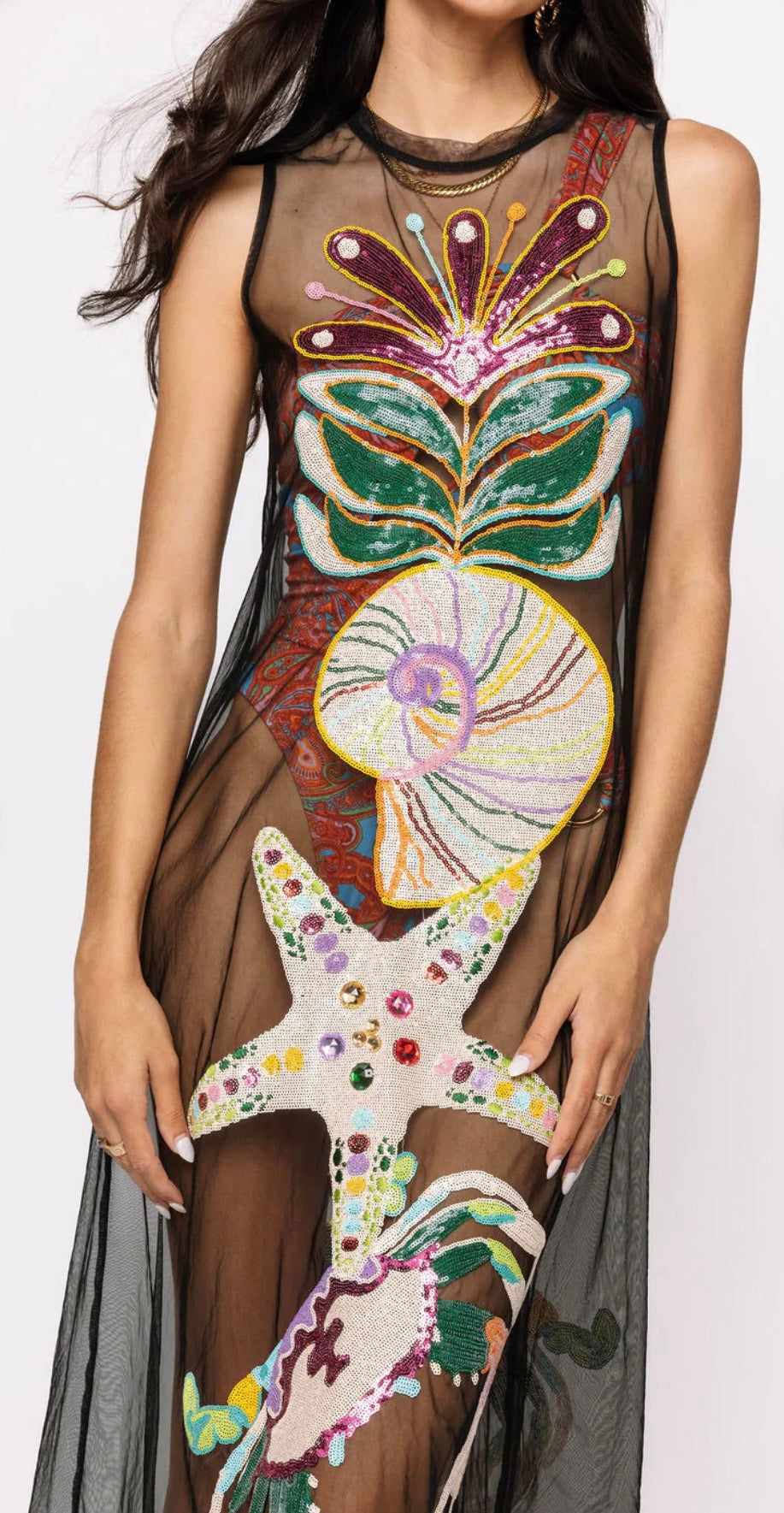 Get ready to sparkle all summer long with the Queen of Sparkles-black mesh Shell Coverup! Perfect for adding a touch of glamour to your beach day as a bathing suit cover up.