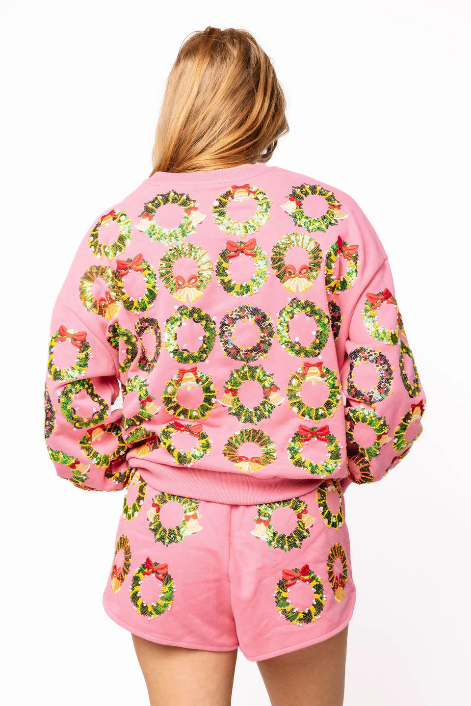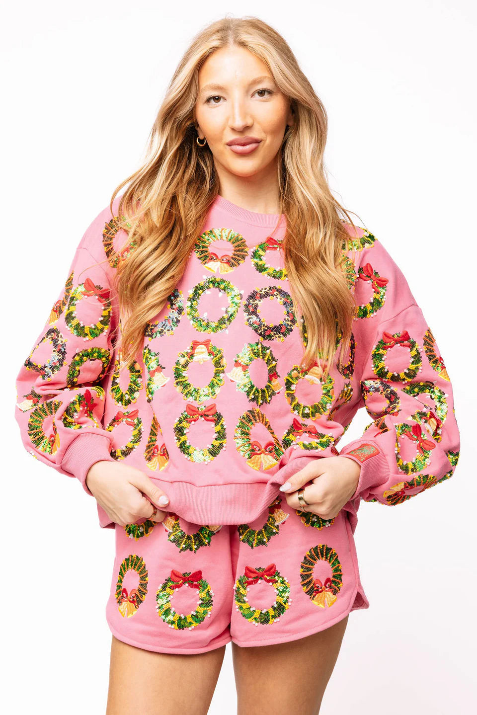 These Hot Pink Multi Wreaths Shorts bring a fun pop of color with an elastic waist for a comfy fit all day long. The charming wreath design adds a playful touch to your look, perfect for pairing with the matching sweatshirt for a coordinated, cheerful outfit. Ideal for lounging or casual outings with a splash of style and ease.