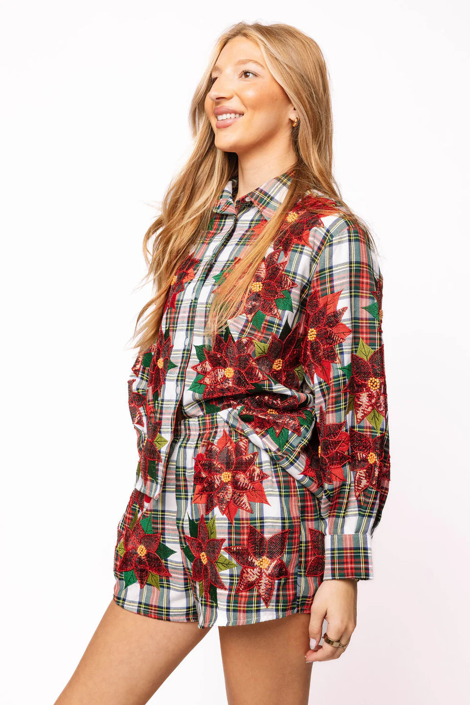 Add some festive sparkle to your wardrobe with this playful red, green, and white plaid button-up top adorned with sequined poinsettias on both front and back. Made from soft cotton, it’s as cozy as it is cheerful. For the full holiday vibe, pair it with the matching shorts and shine bright all season long!