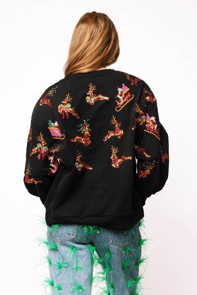 Queen of Sparkles-Black Flying Santa & Reindeer Sweatshirt