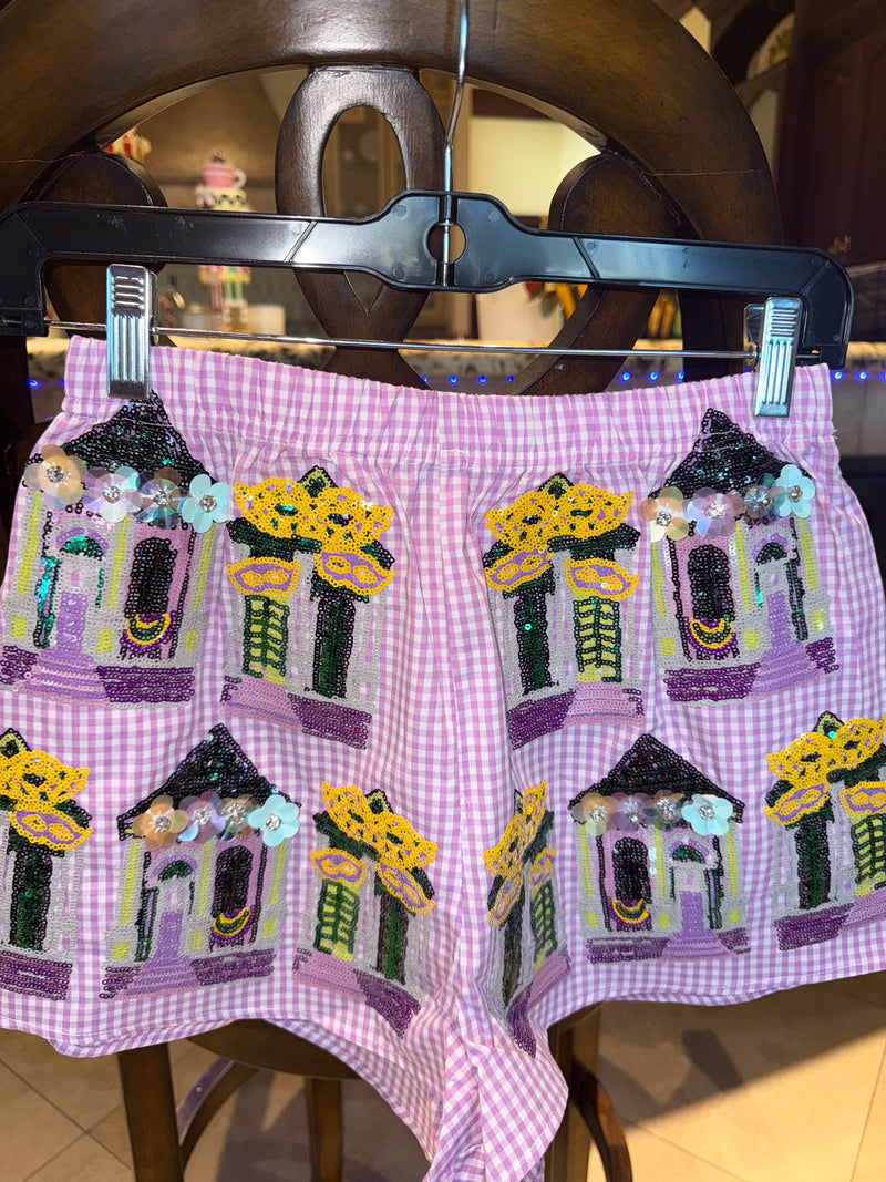 Queen of Sparkles-Mardi Gras Houses Gingham Shorts