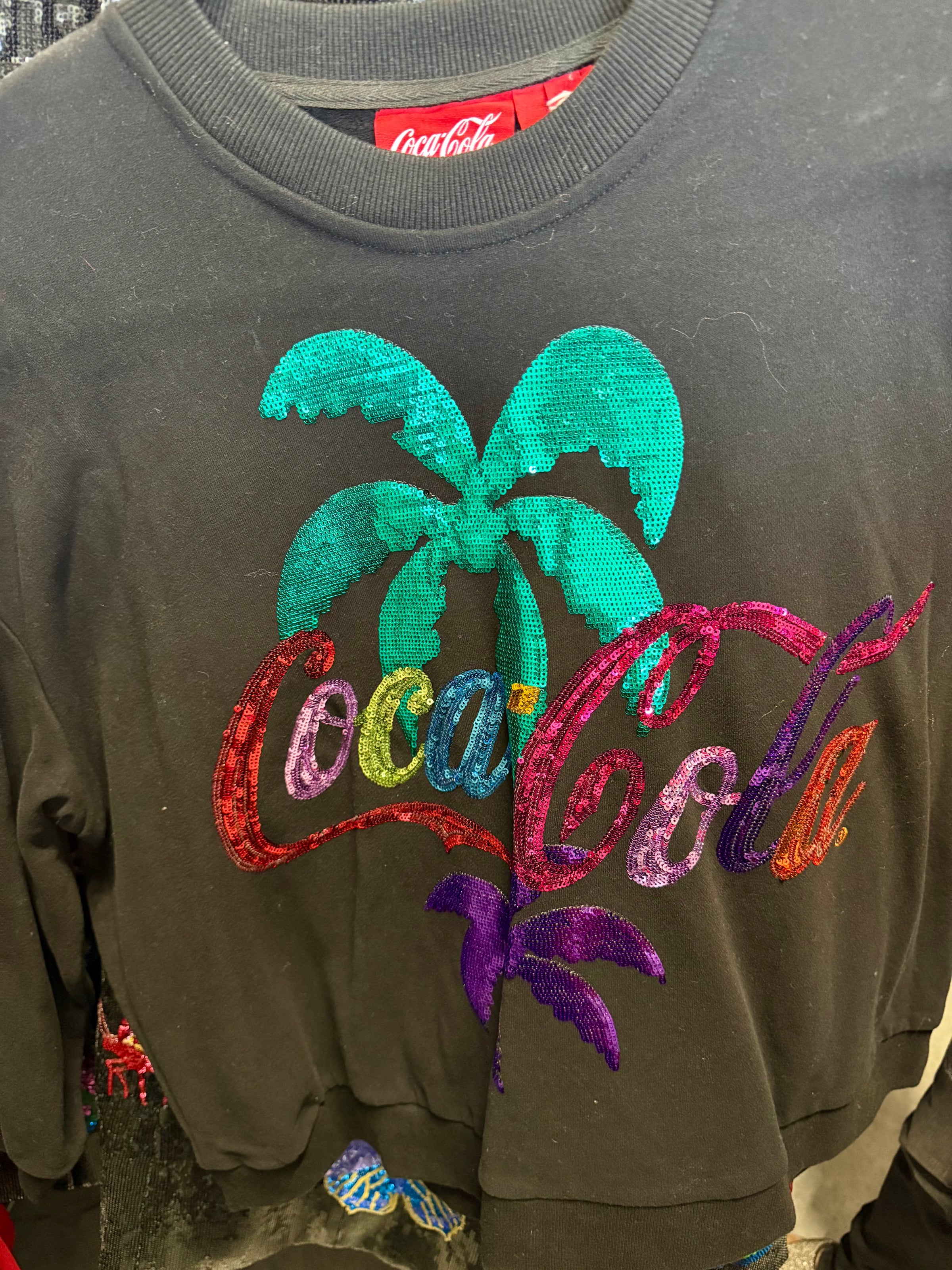 Shine like royalty in this iconic black Coca-Cola sweatshirt that's pure sparkle magic. Covered in eye-catching rhinestones and sequins, this rare gem transforms a classic cola tee into a statement piece that screams glamour. Perfect for anyone who refuses to blend in—wear it to turn heads and steal the spotlight. A blingy treasure that's fresh, fun, and absolutely unforgettable.