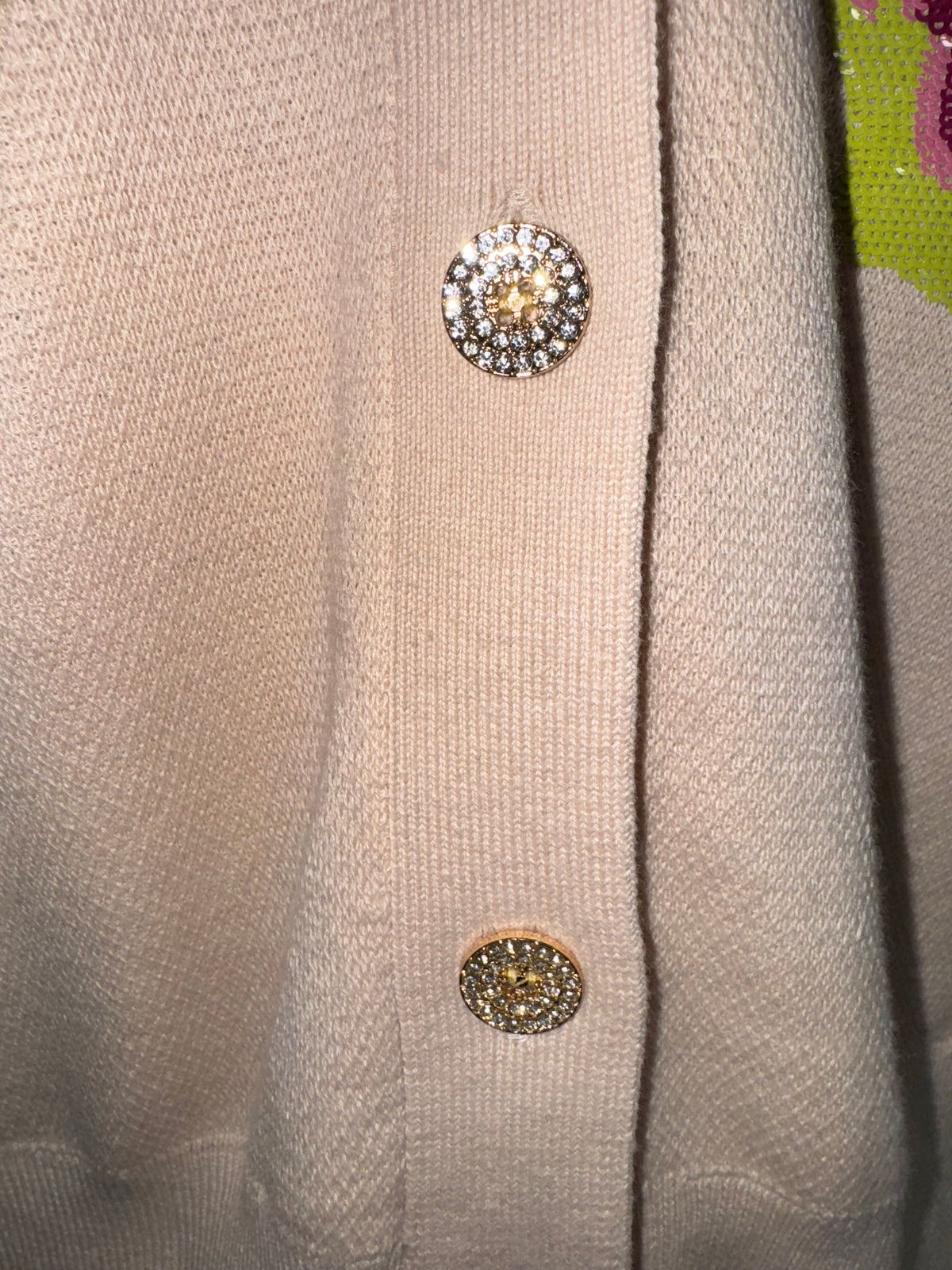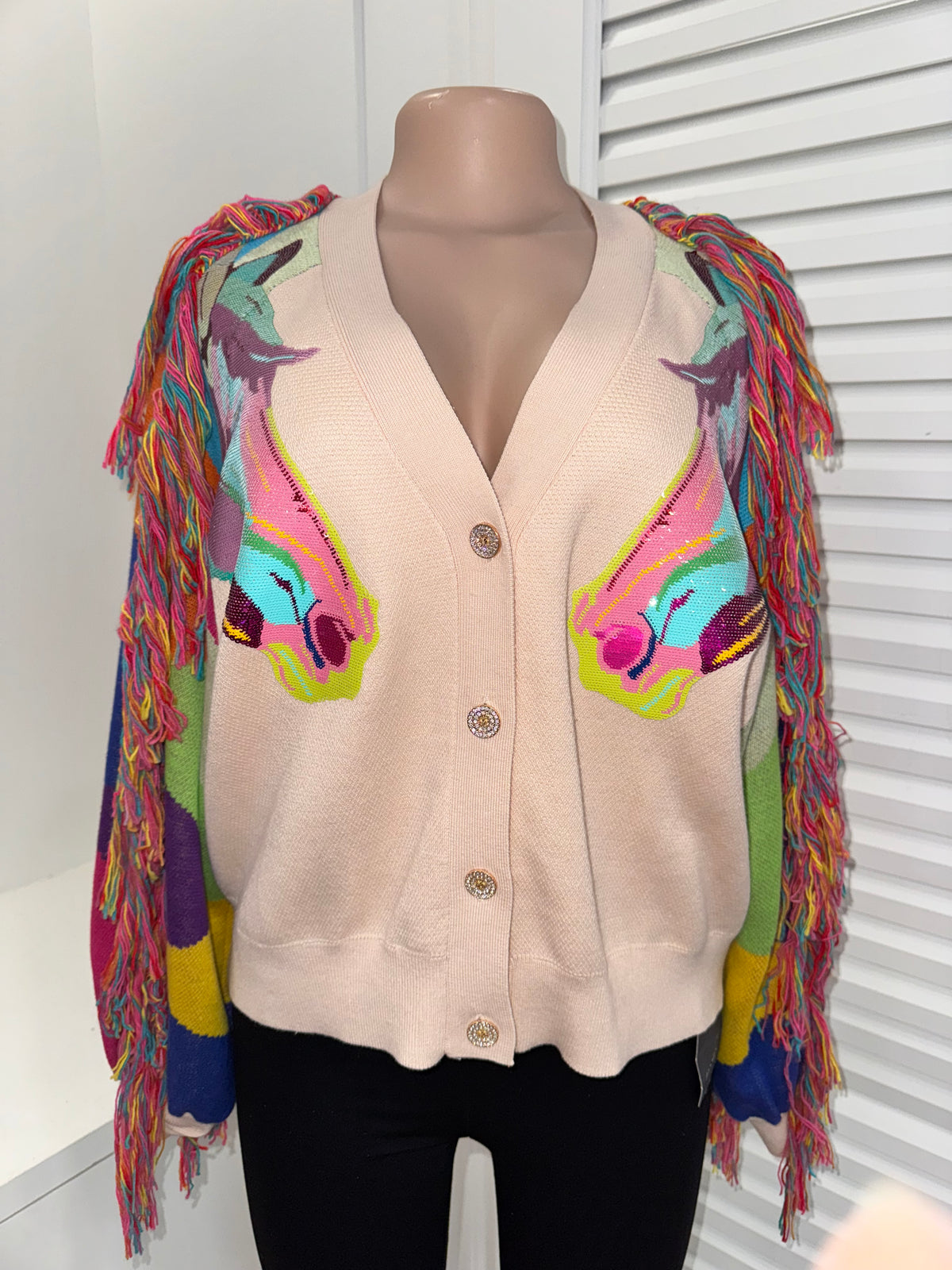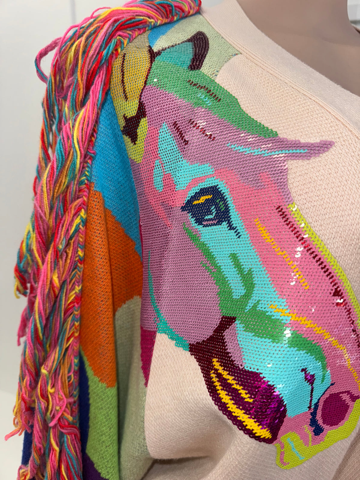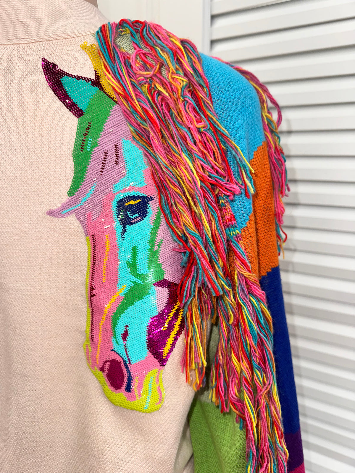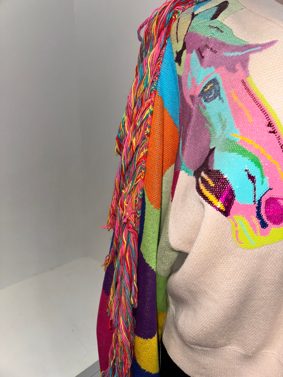 It’s Rodeo time! Be the queen of style with this sparkly cream cardigan sweater, featuring a fun fringe horse hair design. Rhinestone button detail, sequin appliqué horse head and thin multi color yarn fringe on arms. Stay cozy and add some whimsy to your wardrobe.