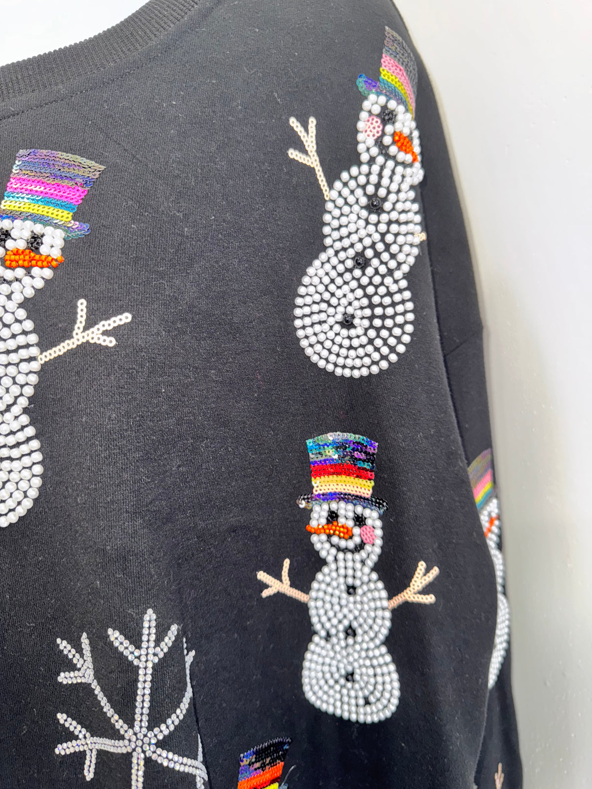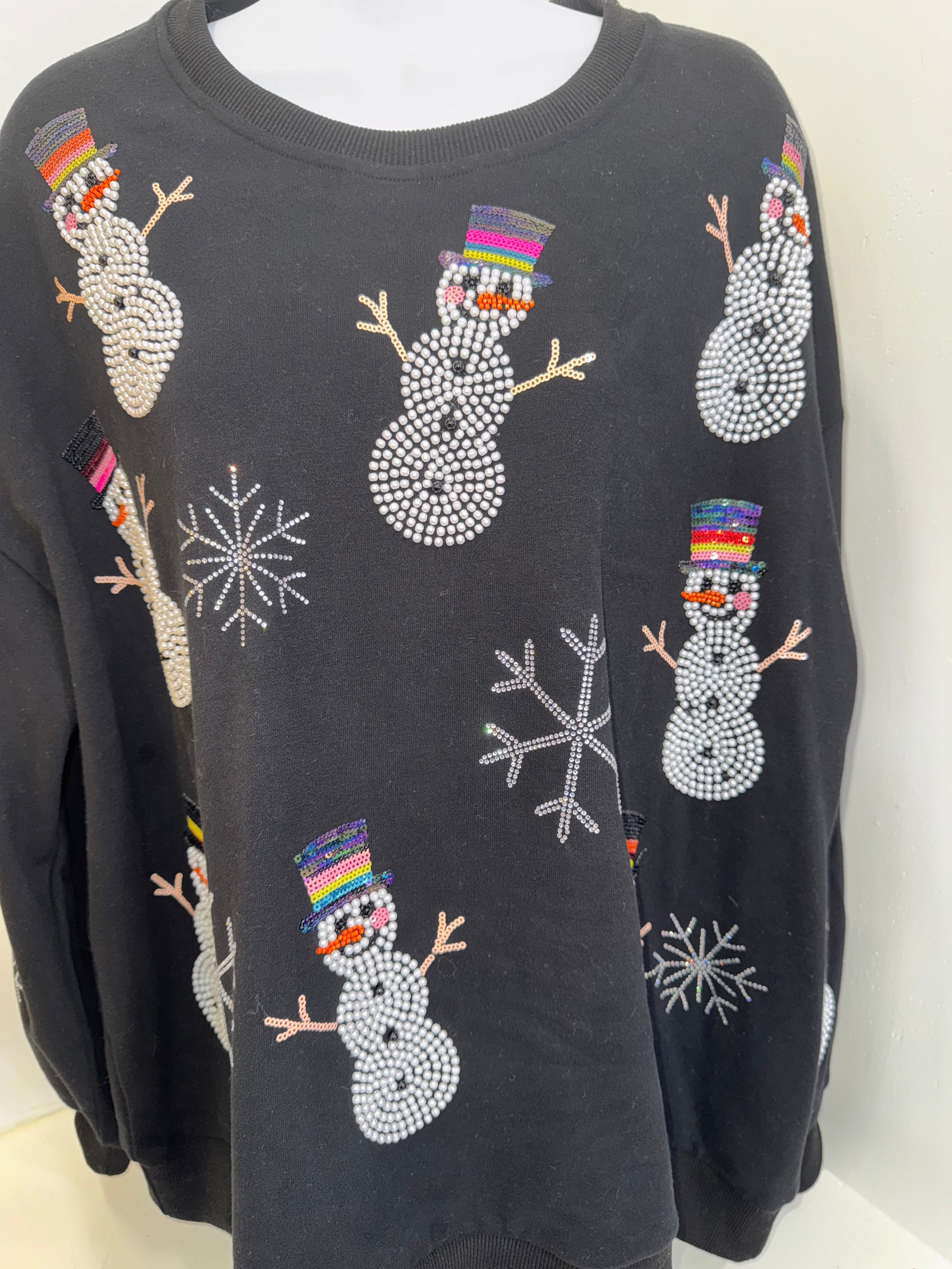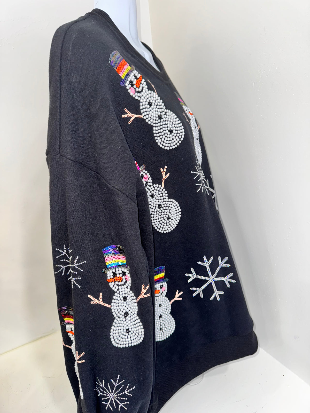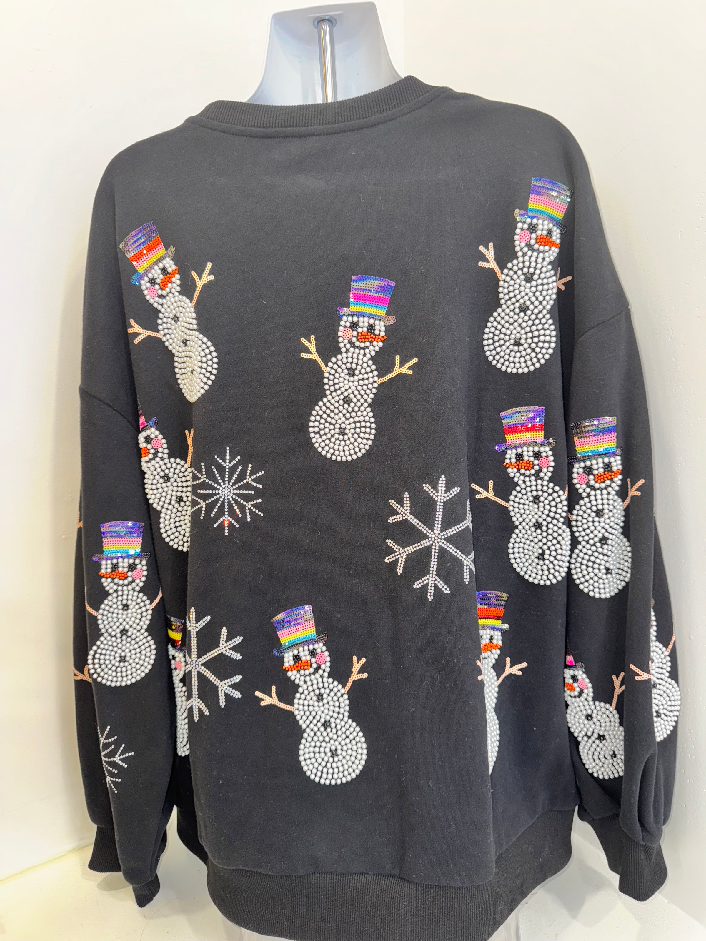 Stay cozy and jolly all winter long with the Queen of Sparkles-Snowman Sweatshirt! This comfy and blingy sweatshirt features a beaded snowman design on the front, back, and arms, adding a touch of sparkle to your holiday and winter wardrobe. Perfect for those who love to shine, even in the cold!