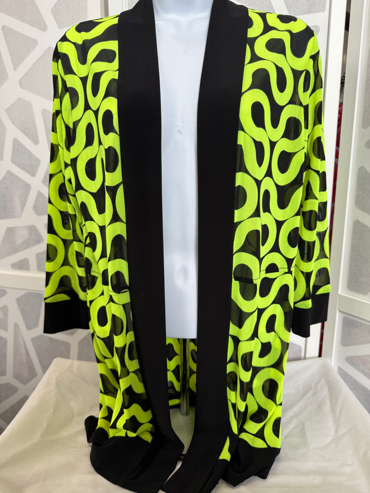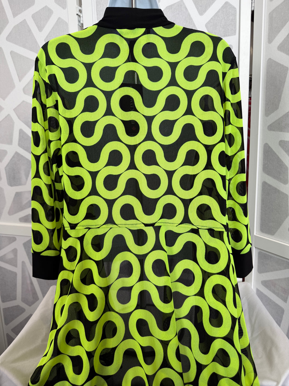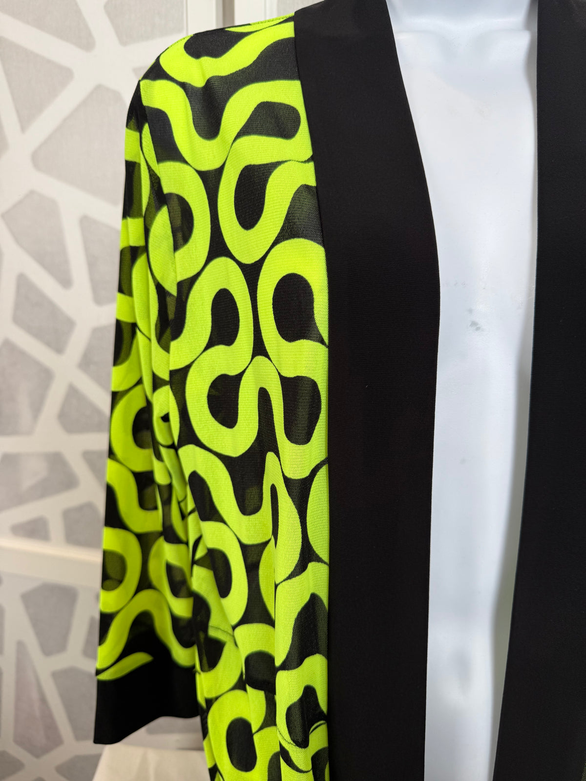This Frank Lyman lightweight jacket features a lime green geo print on black in a mesh-like fabric.