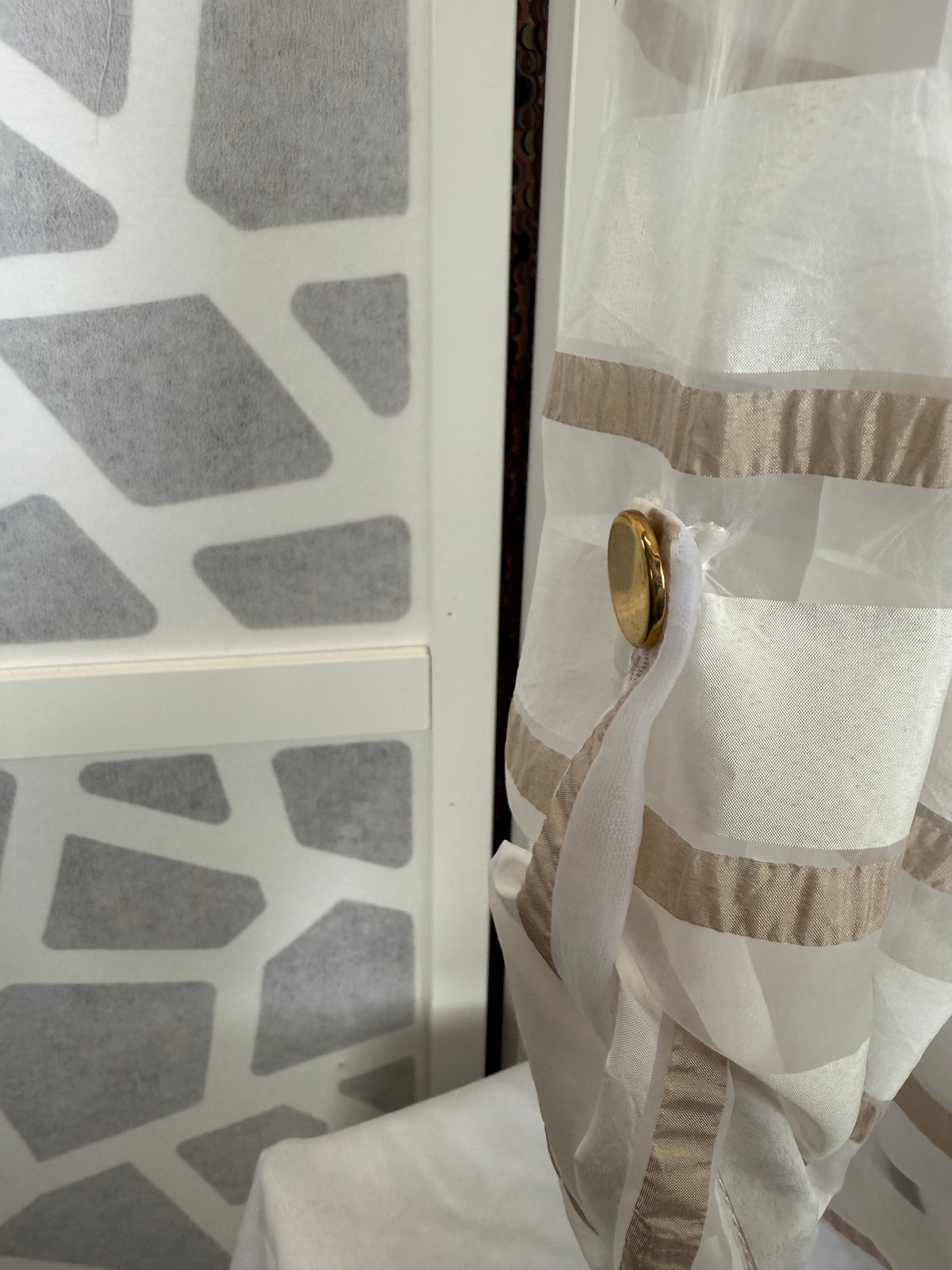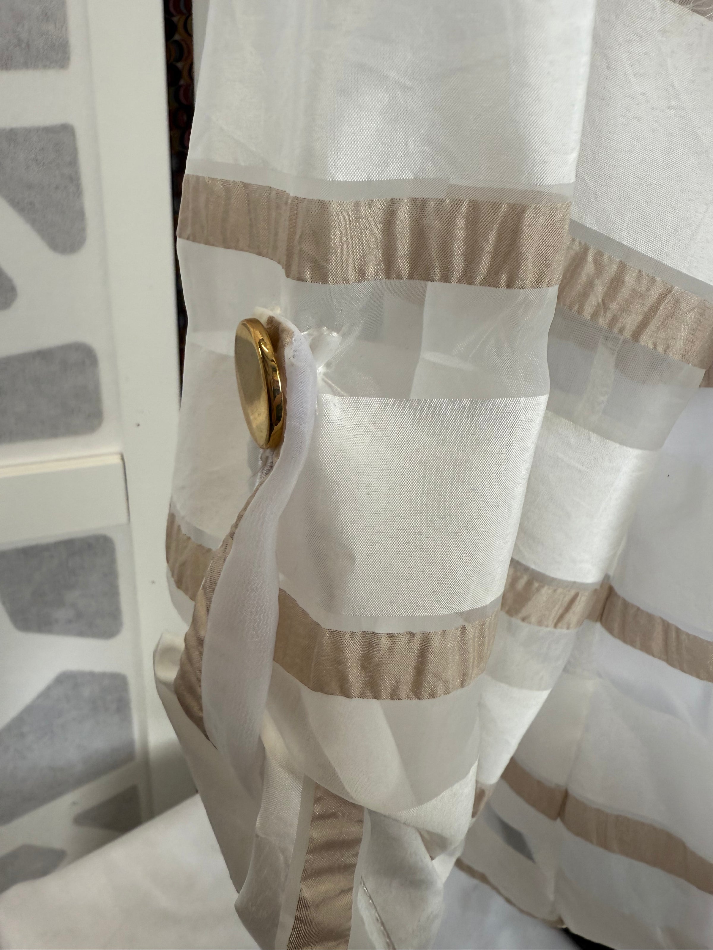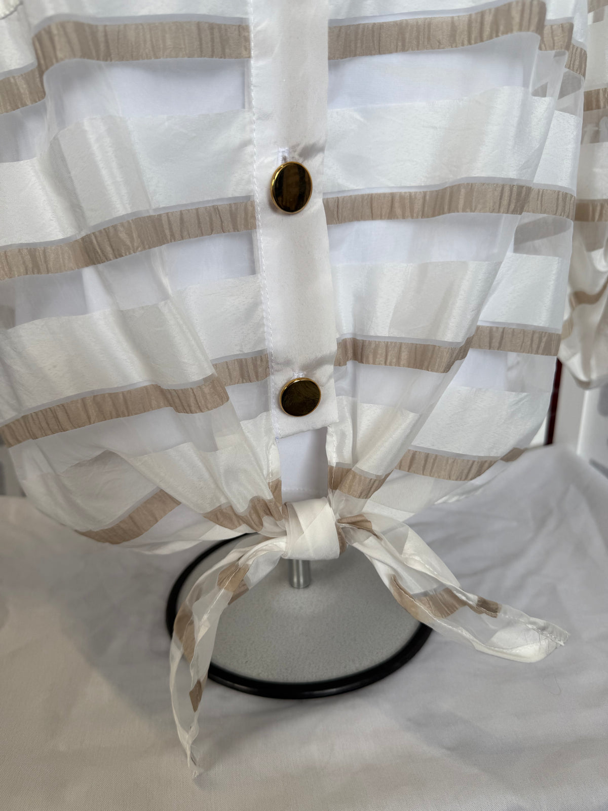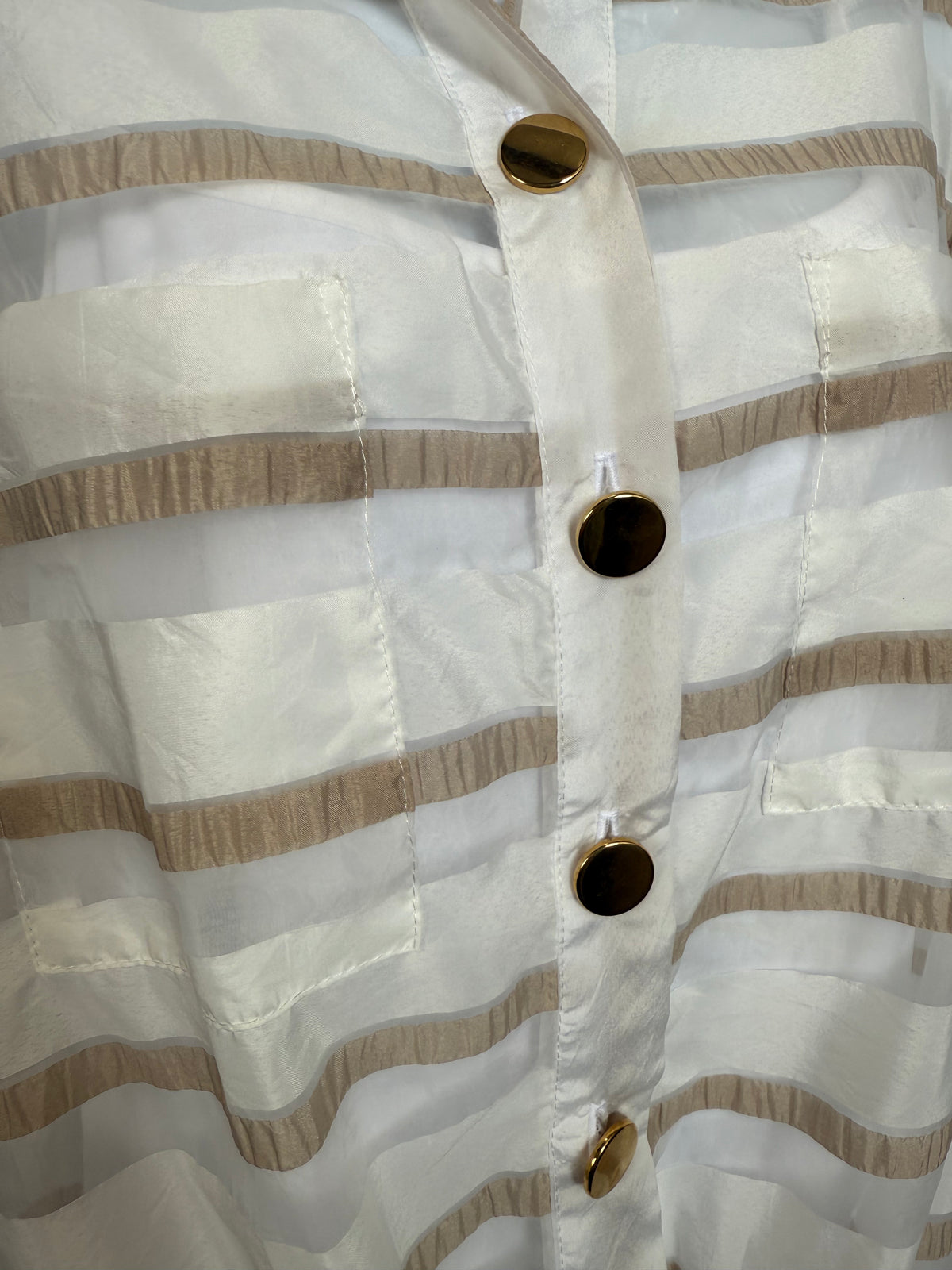 Button down top with 3/4 sleeves, collar, pockets, white cami underneath, gold metal buttons and tie knot at waist.