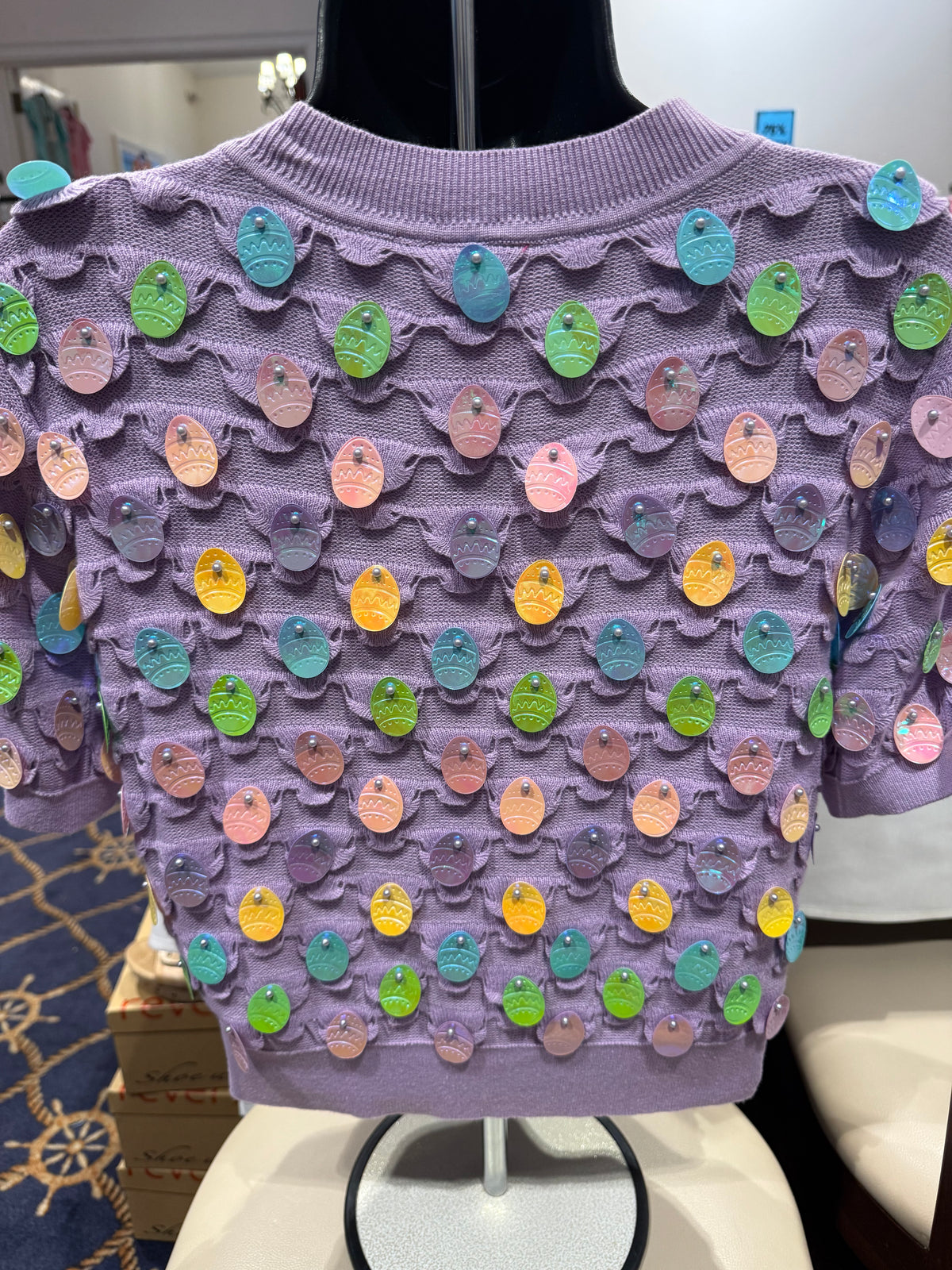 Add a fun and festive touch to your wardrobe with this playful lavender knit cropped sweater, featuring eye-catching 3D large egg-shaped sequins. Perfect for Easter or anytime you want to shine, this short-sleeve sweater combines comfort with sparkling charm for a look that's both cozy and bold.