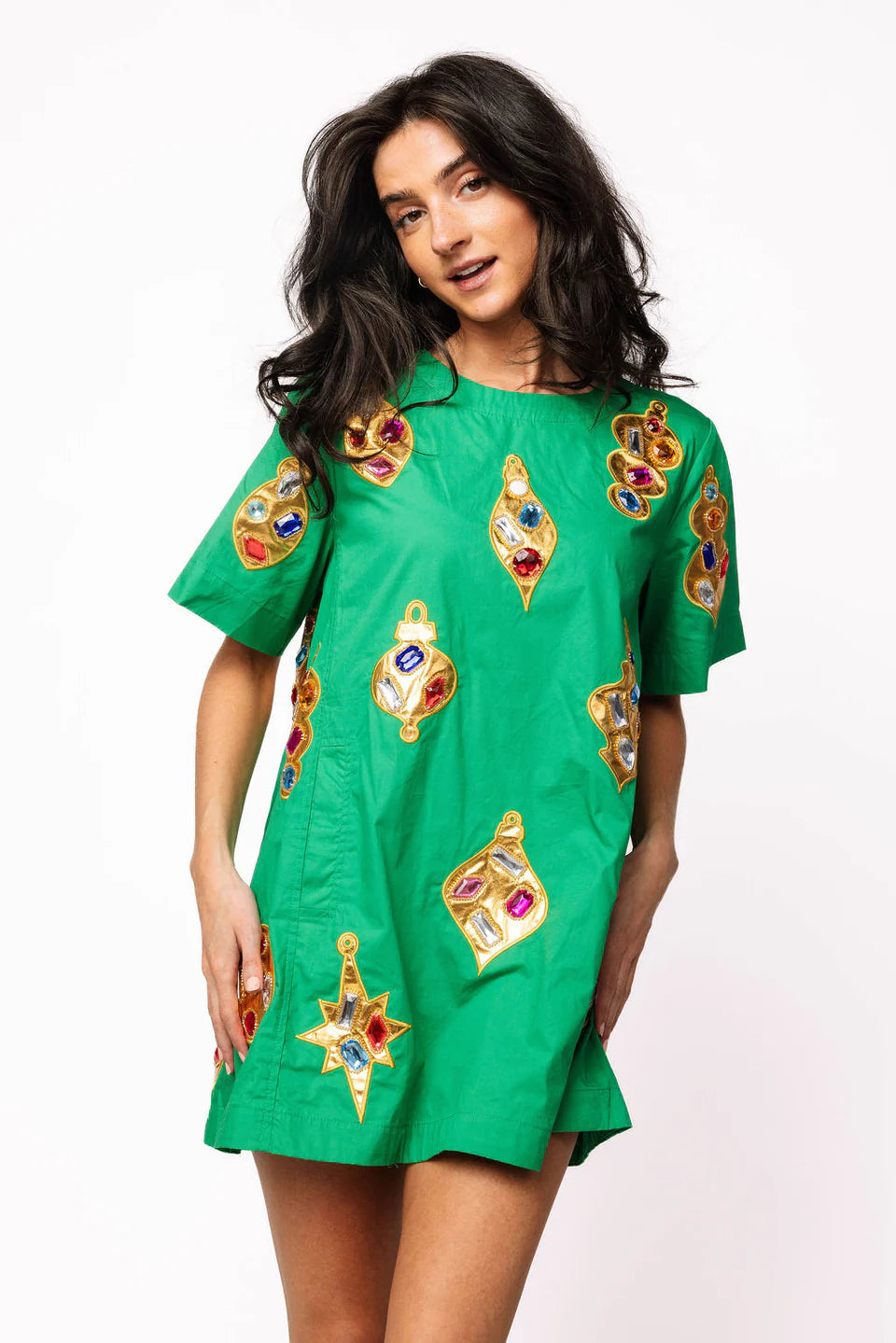 Queen of Sparkles-Green & Gold Jeweled Ornament Cotton Short Sleeve Dress