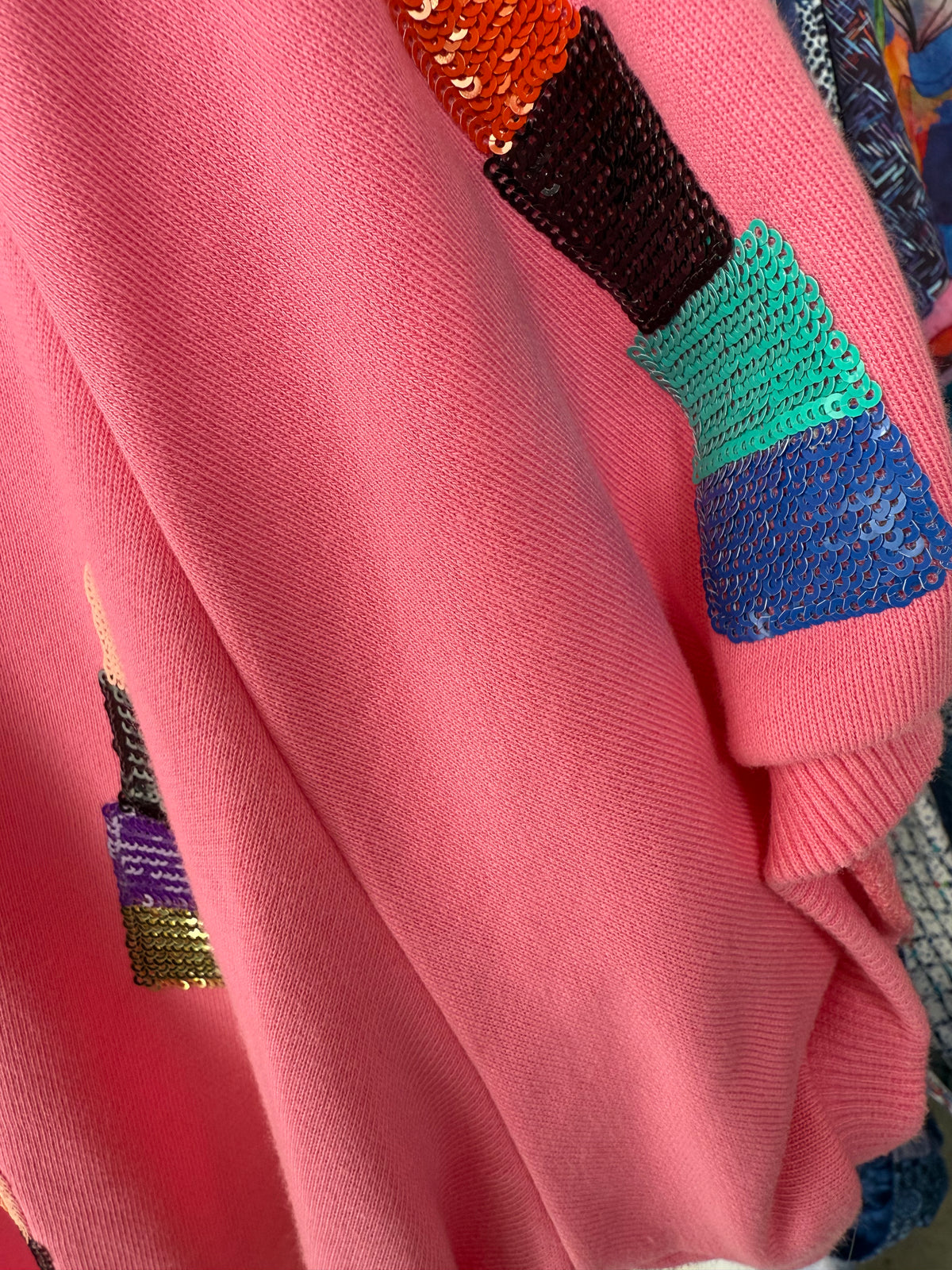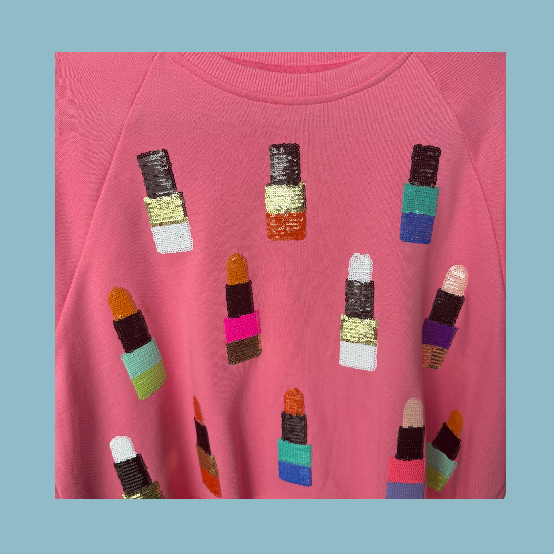 Add a sparkle to your casual wardrobe with the Queen of Sparkles Pink Lipstick Crop Top. This comfy, short-sleeve sweatshirt-style crop top features dazzling blingy lipstick designs that make a fun, bold statement. Perfect for those who love a playful twist on everyday style, it pairs effortlessly with the matching shorts.
