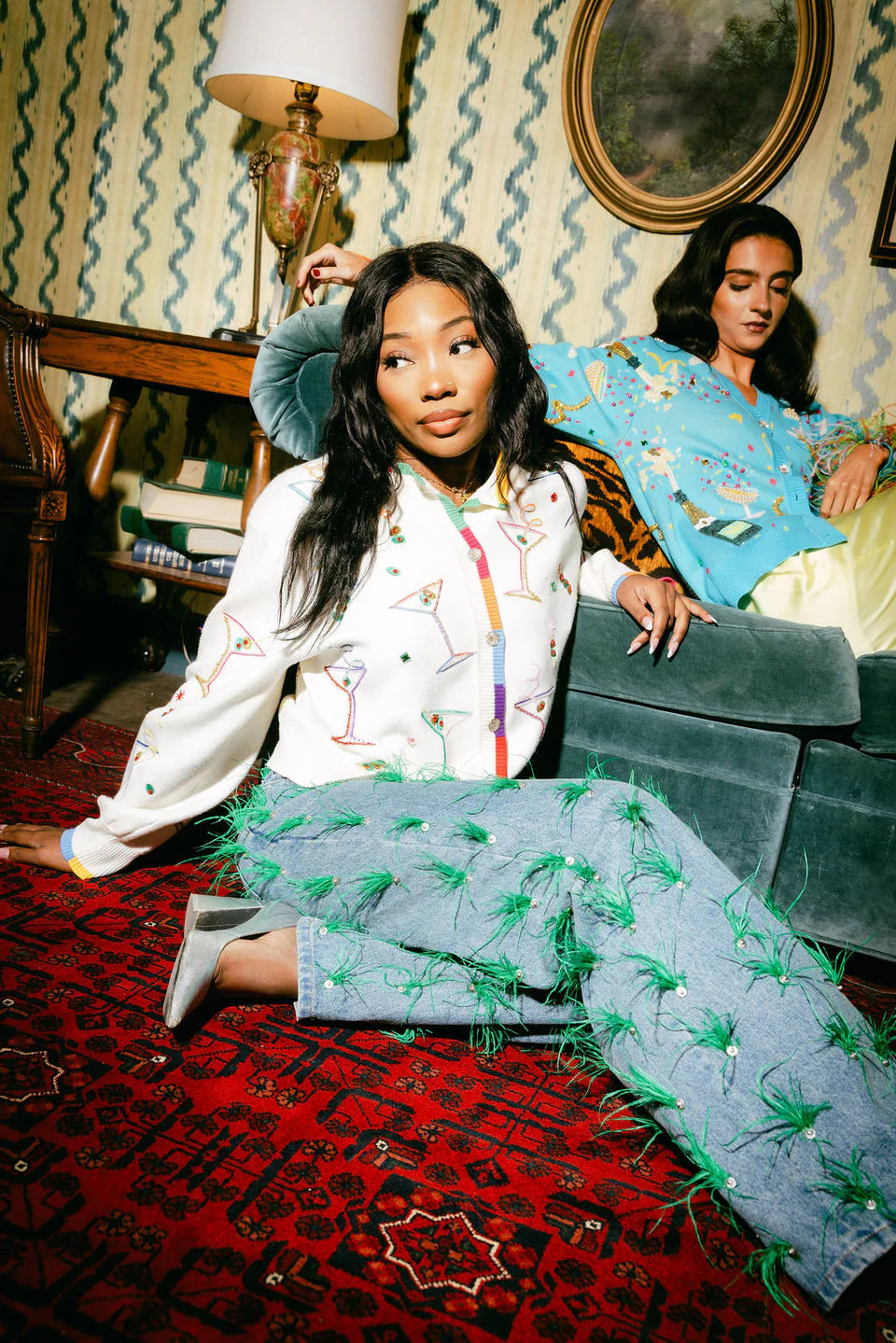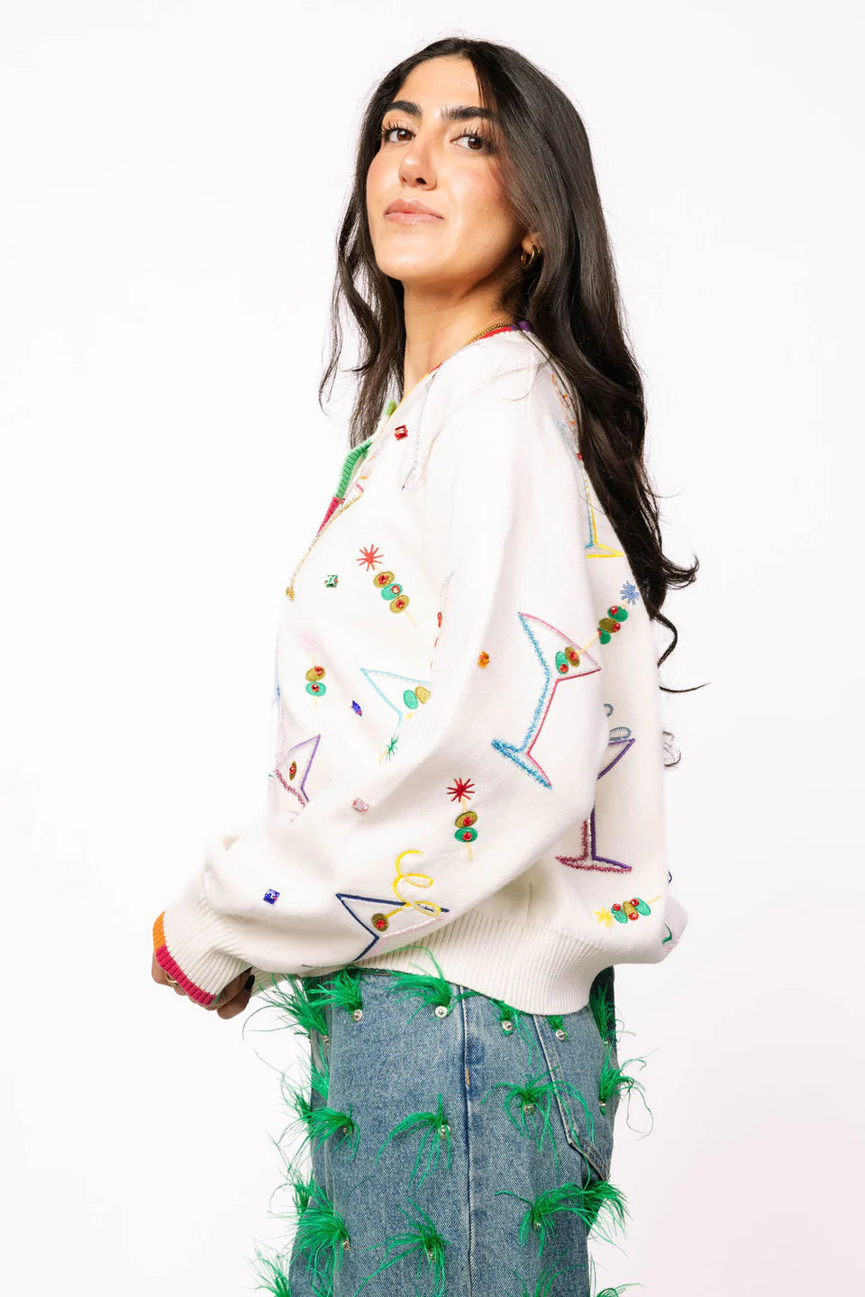 Raise a toast to fun fashion with this white button-up cardigan that's basically a wearable cocktail hour! Featuring vibrant multi-colored martinis and olives scattered across the front and back, it's topped off with a rainbow trim framing the neckline and buttons. Perfect for parties, girls' nights out, or whenever you want to add a splash of whimsy to your wardrobe. This playful piece proves that style and personality go hand in hand—cheers to that!