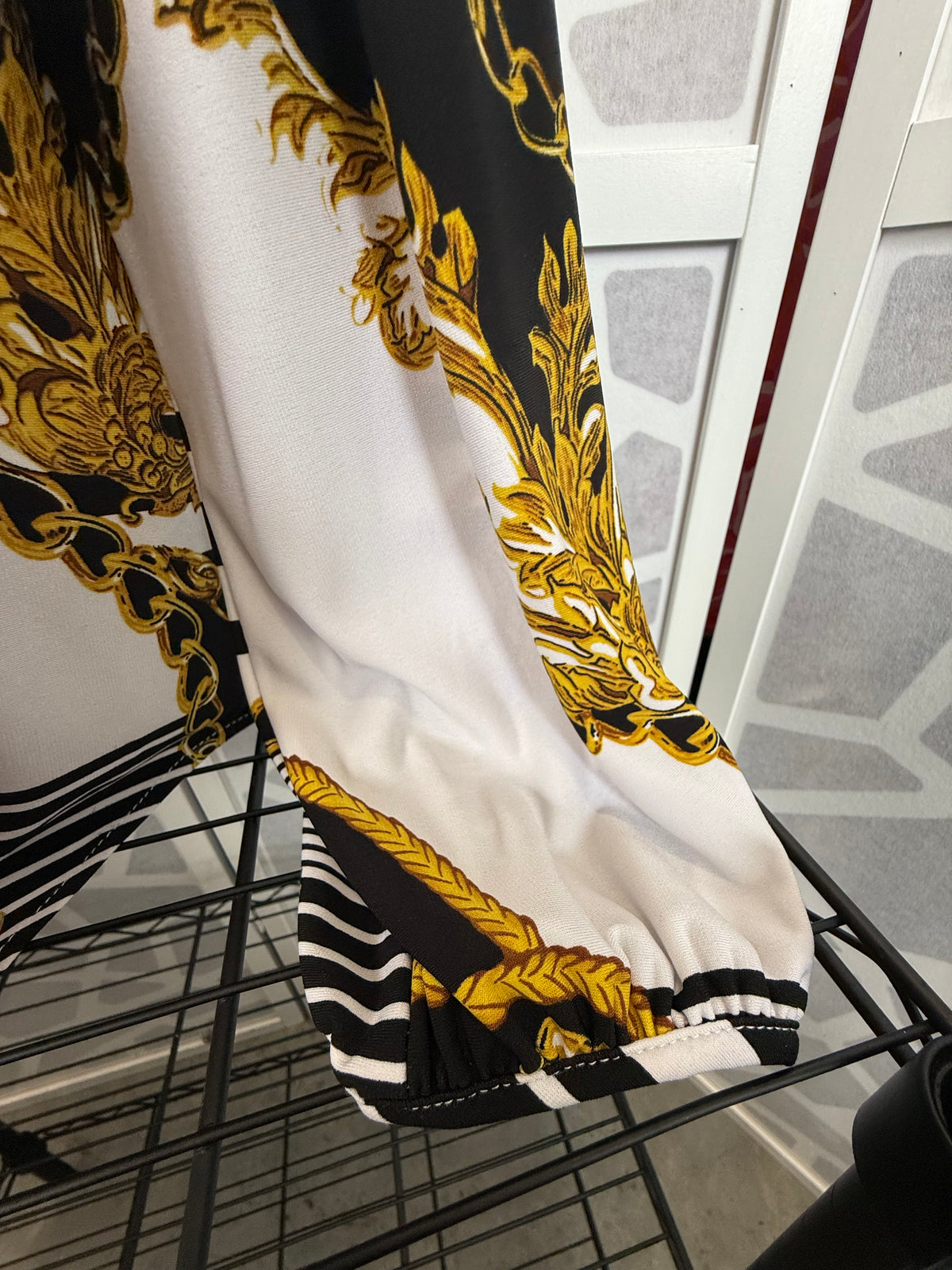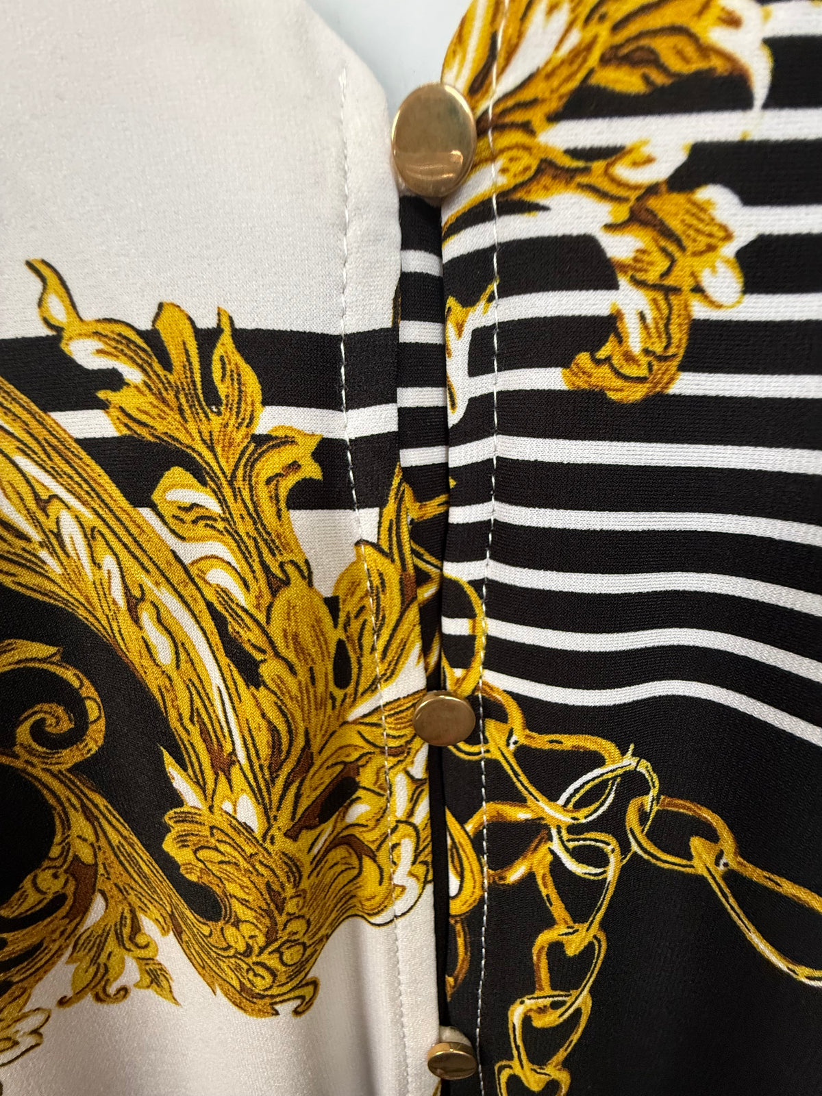 Long sleeve, v-neck top with delicate gold metal buttons and tie knot waist.